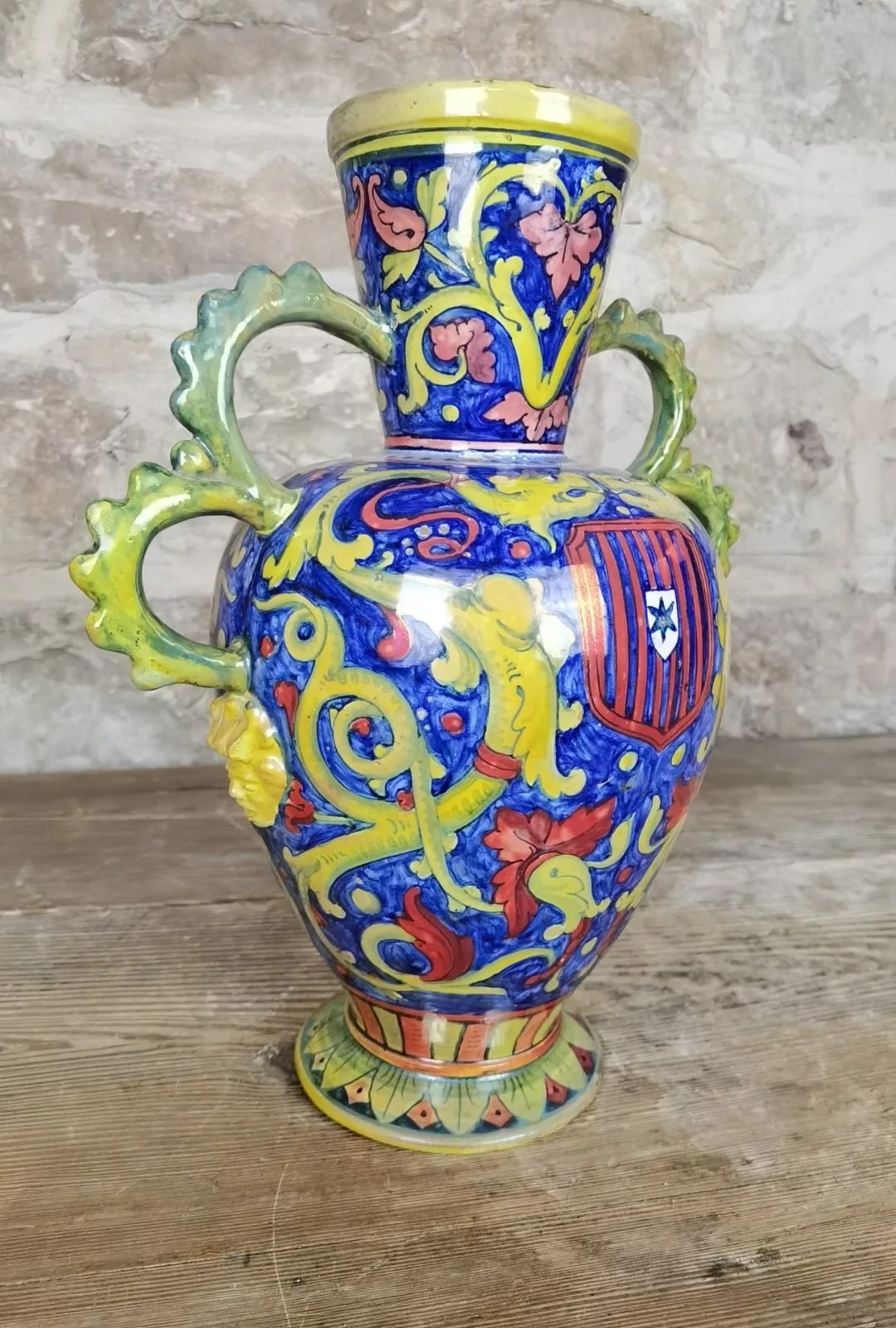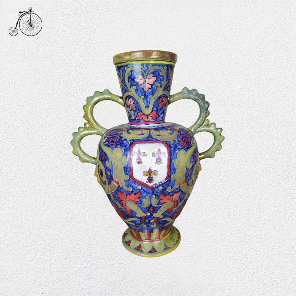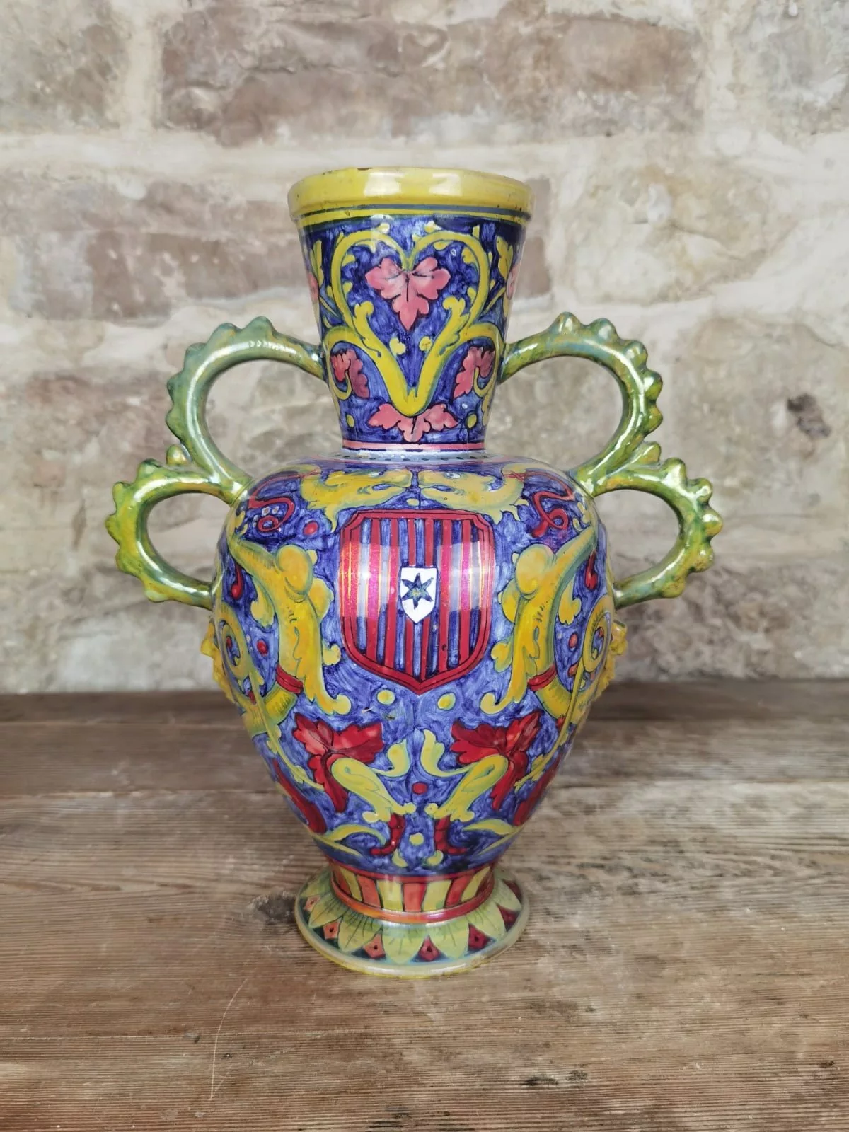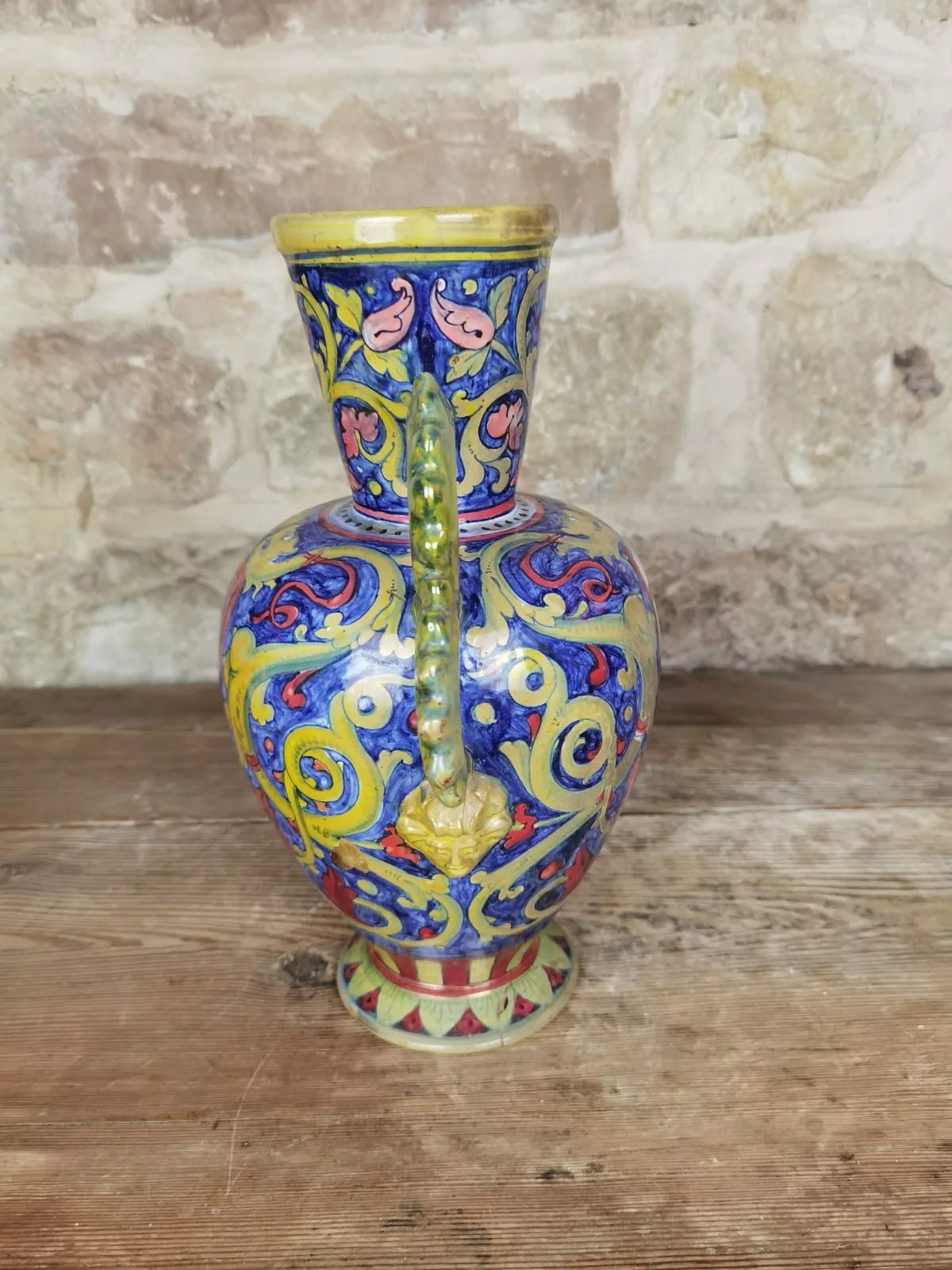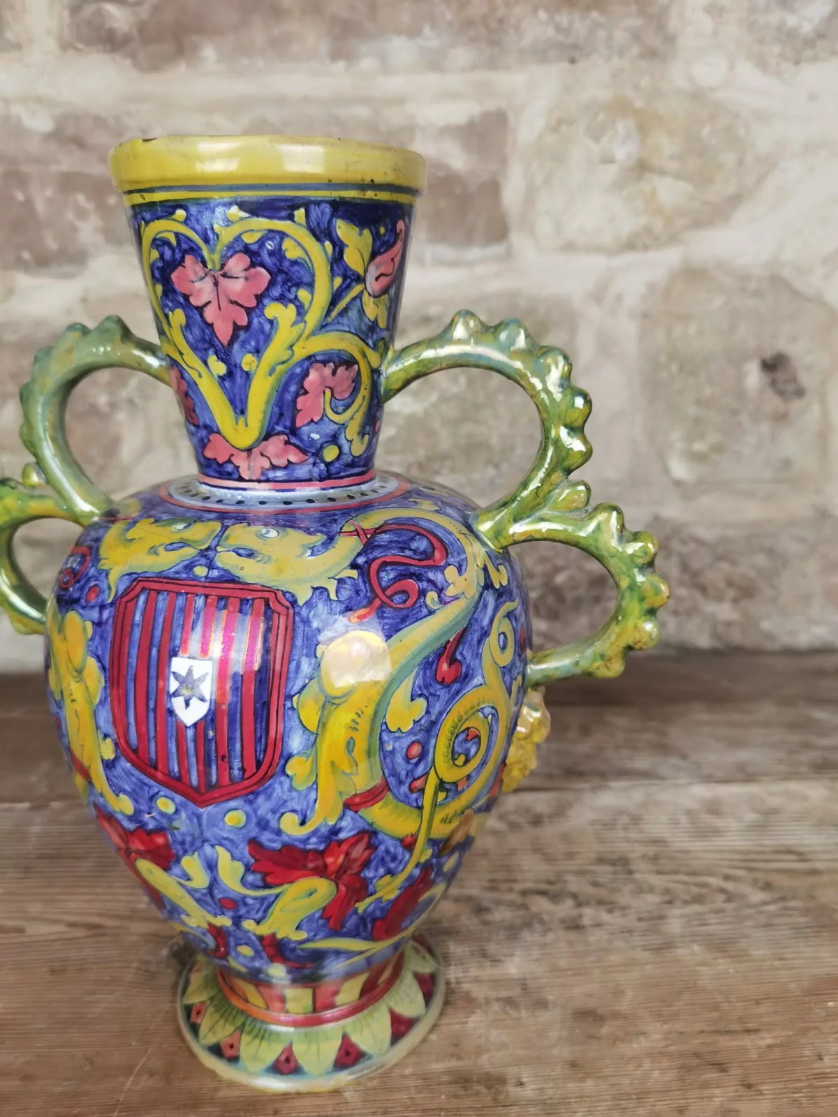 Anfora Moresca, degli anni ’40 circa, realizzata dalla S. Ceramica Umbra Rubboli, in ceramica con manici centinati a lustri oro e rubino.