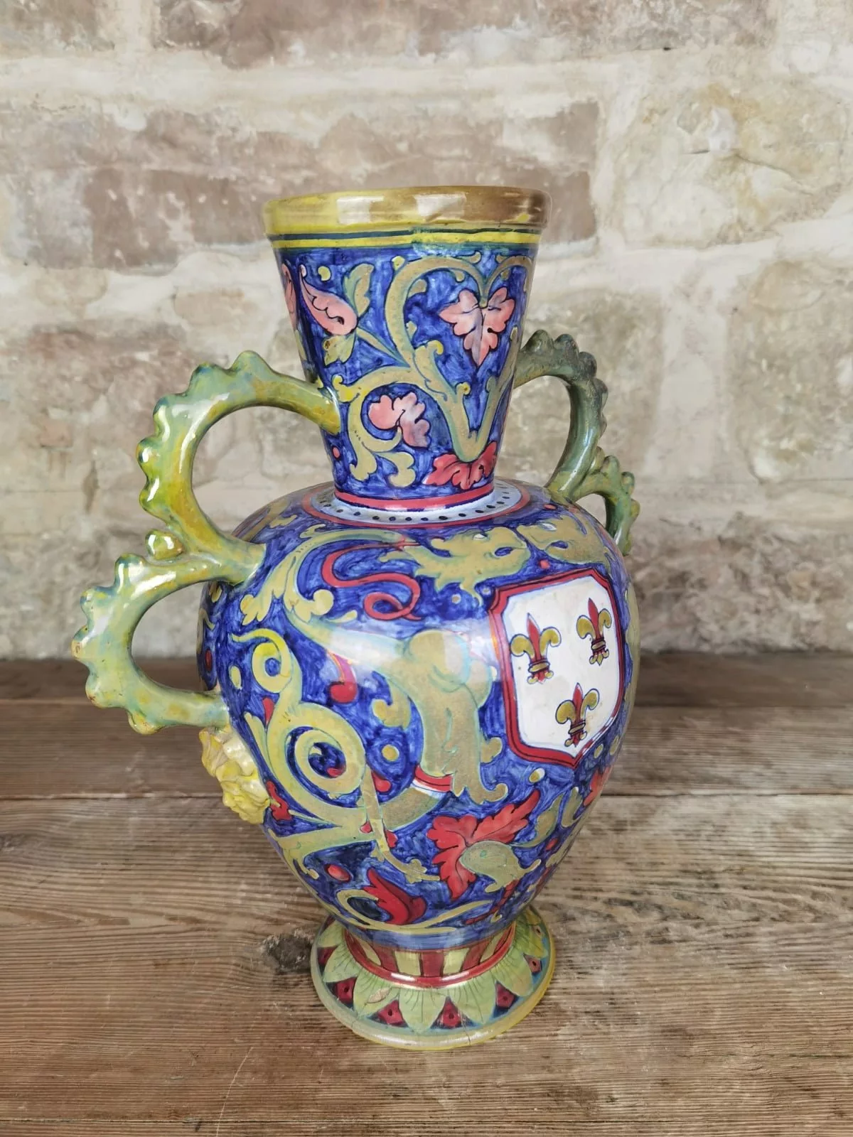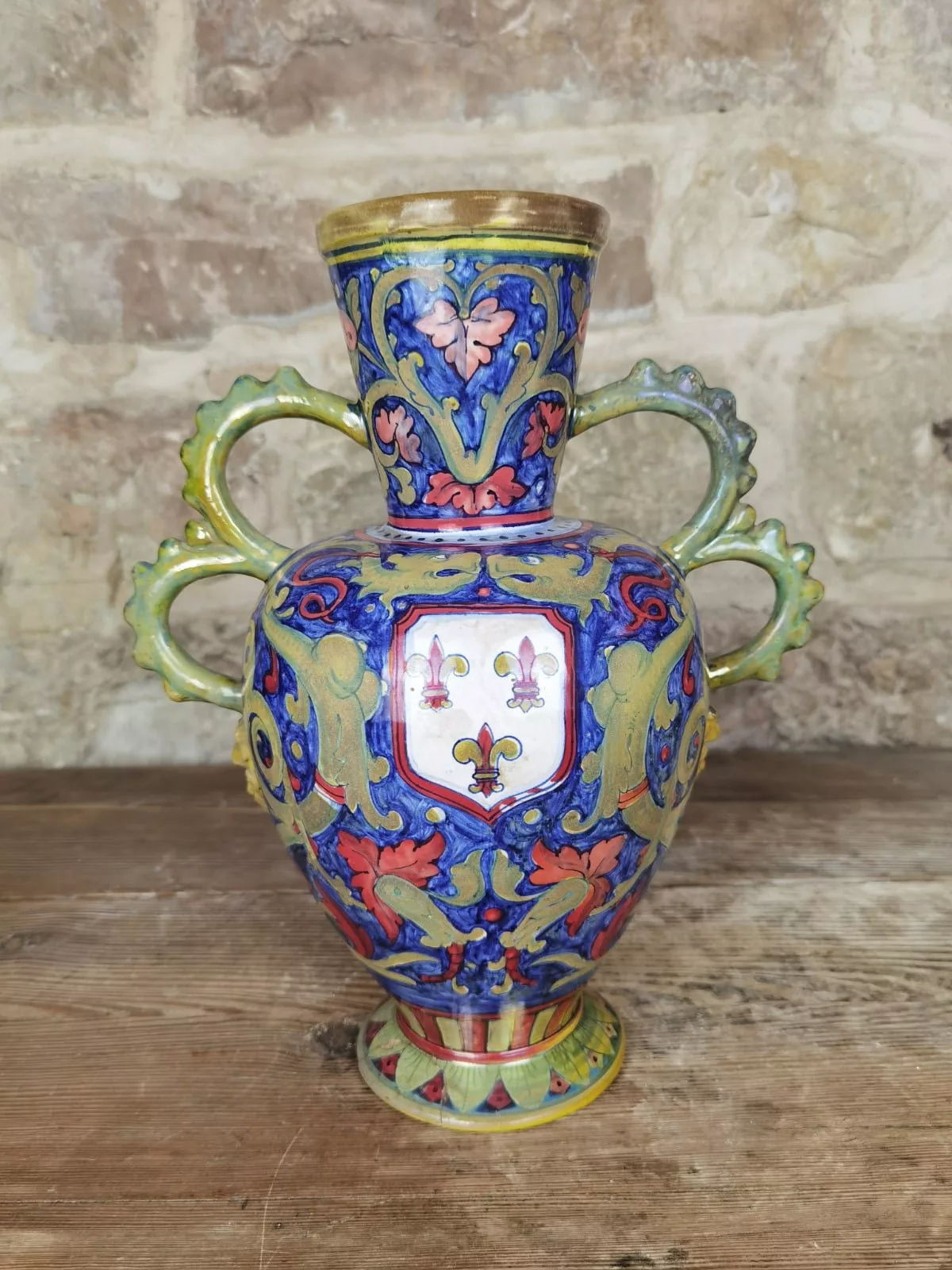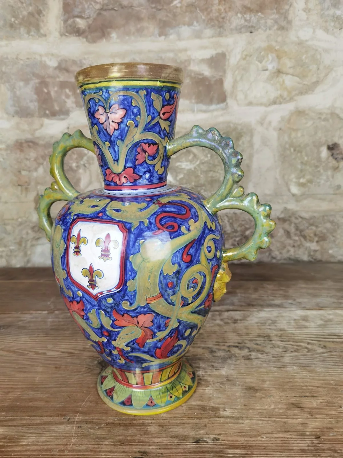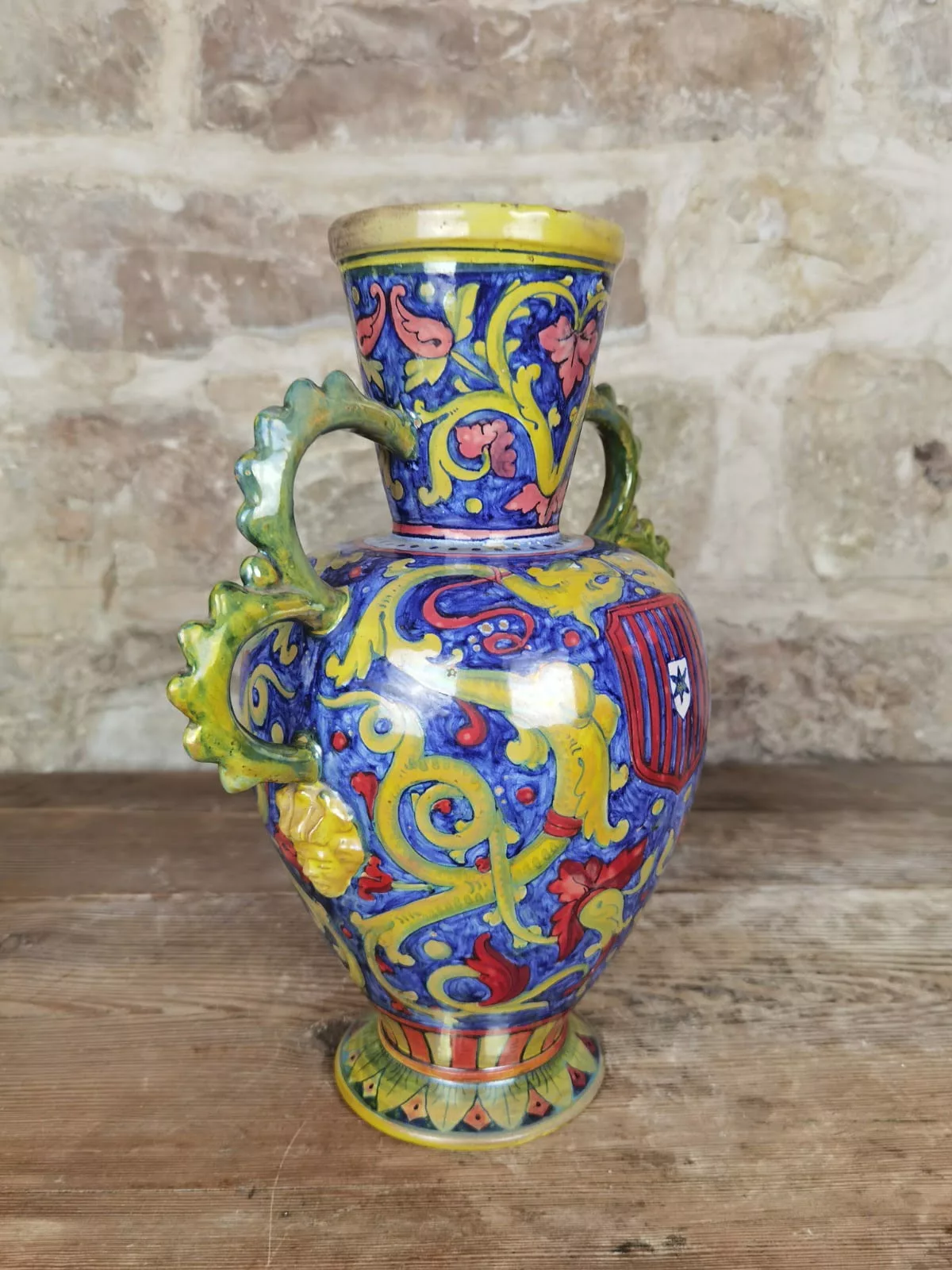 Anfora Moresca, degli anni ’40 circa, realizzata dalla S. Ceramica Umbra Rubboli, in ceramica con manici centinati a lustri oro e rubino.