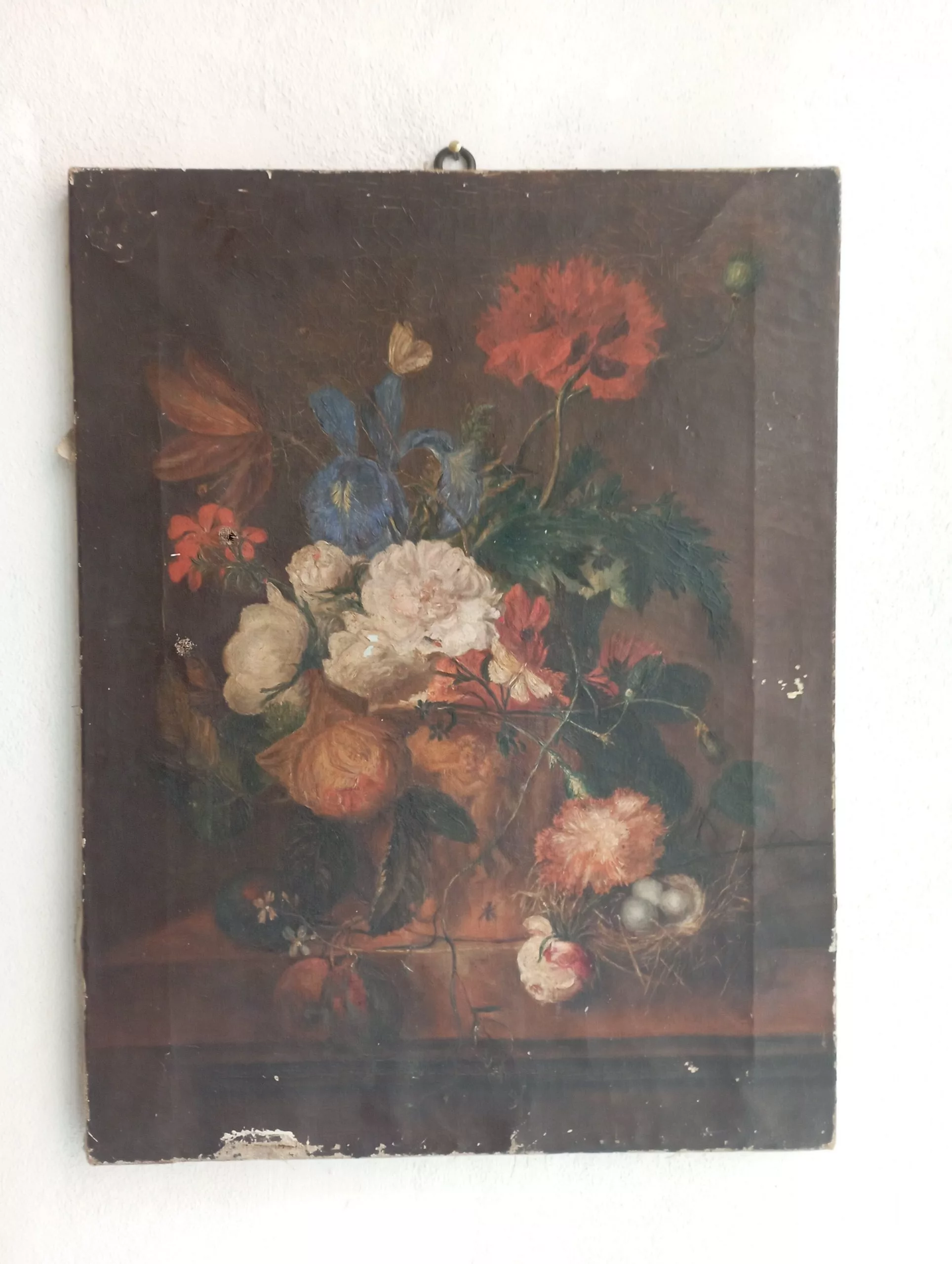 Copia Coeva del famoso quadro “Mazzo di Fiori” di Jan van Huysum del quale quadro originale si trova agli Uffizi a Firenze dopo essere stato trafugato Wehrmacht nel 1943 a seguito della ritirata dell’occupante tedesco conseguente allo sbarco degli Alleati in Italia in seguito restituito dopo 75 anni, il 19 luglio 2019 dal ministro degli Esteri tedesco Heiko Maas nel corso della cerimonia di restituzione che si è svolta nella Sala bianca di Palazzo Pitti. La copia è stata riprodotta, dall’artista Eugènie Andrè-Viollier, in modo magistrale fino ai minimi dettagli.