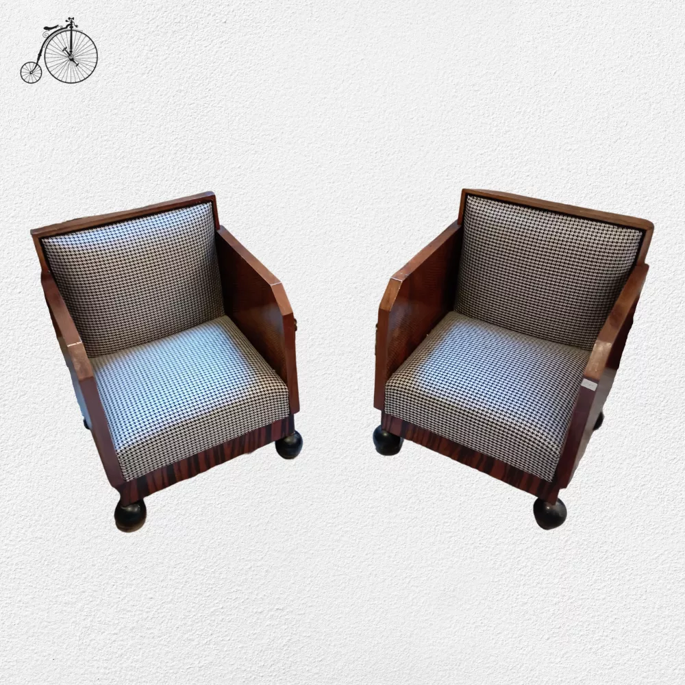 Coppia Poltrone Deco’ degli inizi del ‘900 con colori tipici del periodo e molto eleganti in legno lucidato in gommalacca e nero lucido.