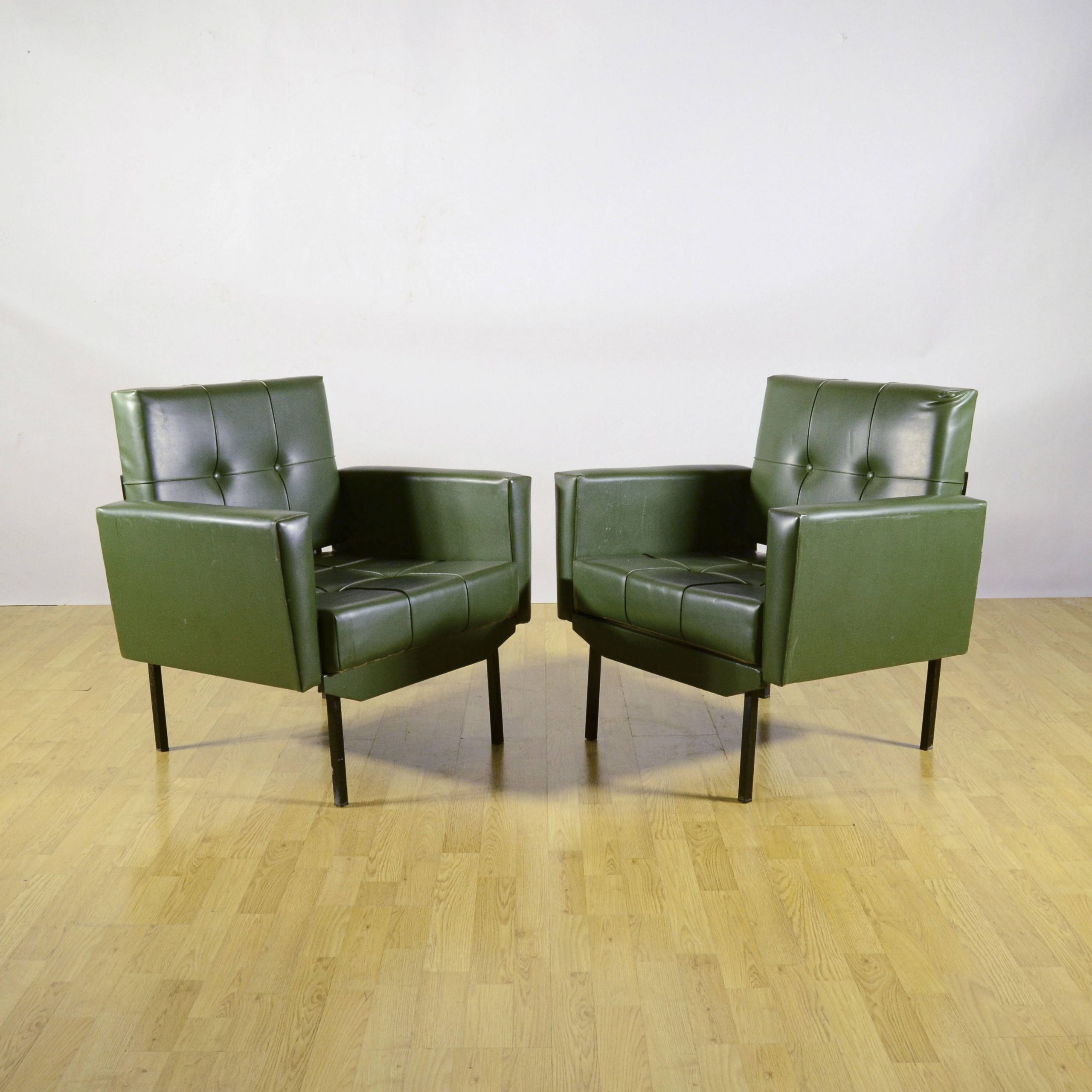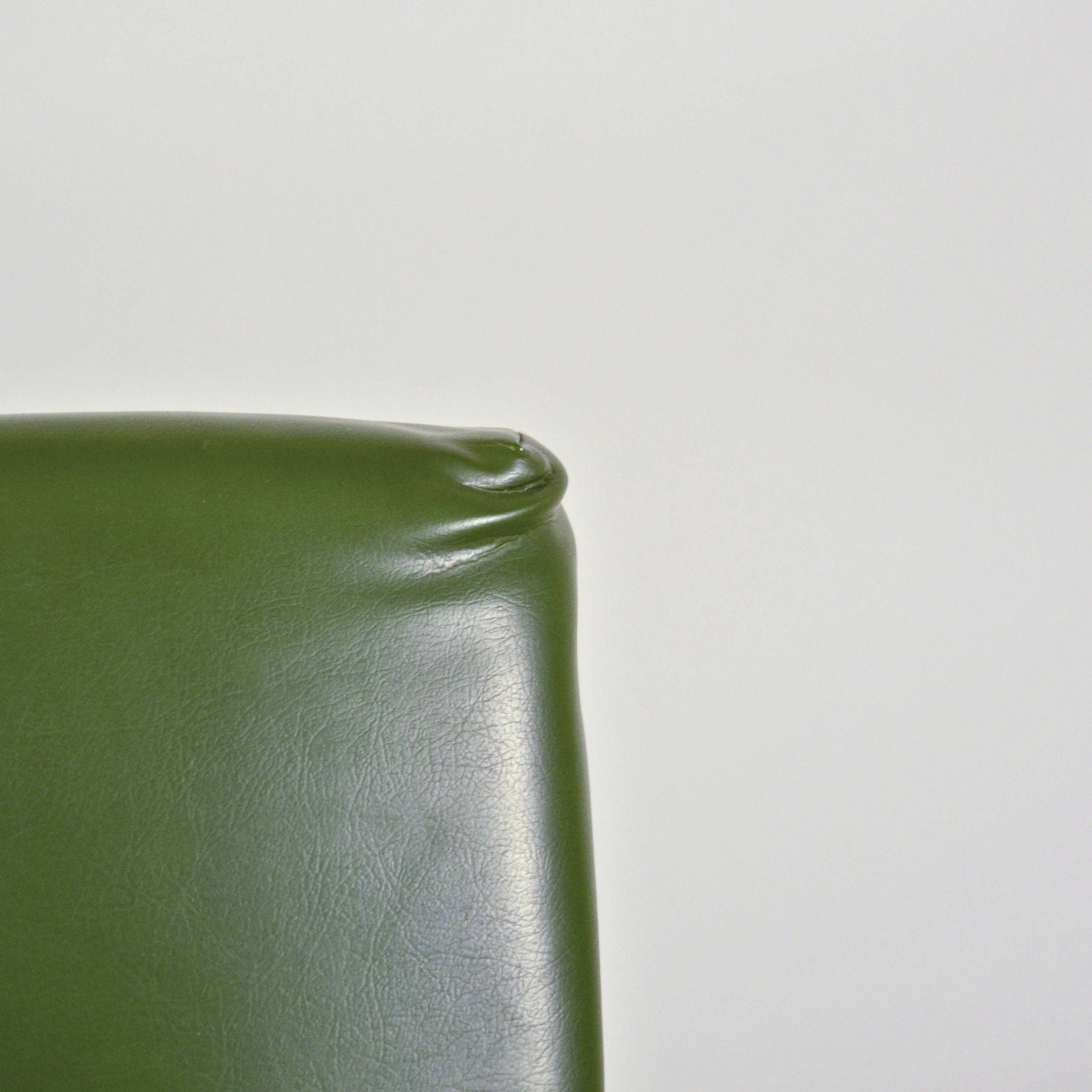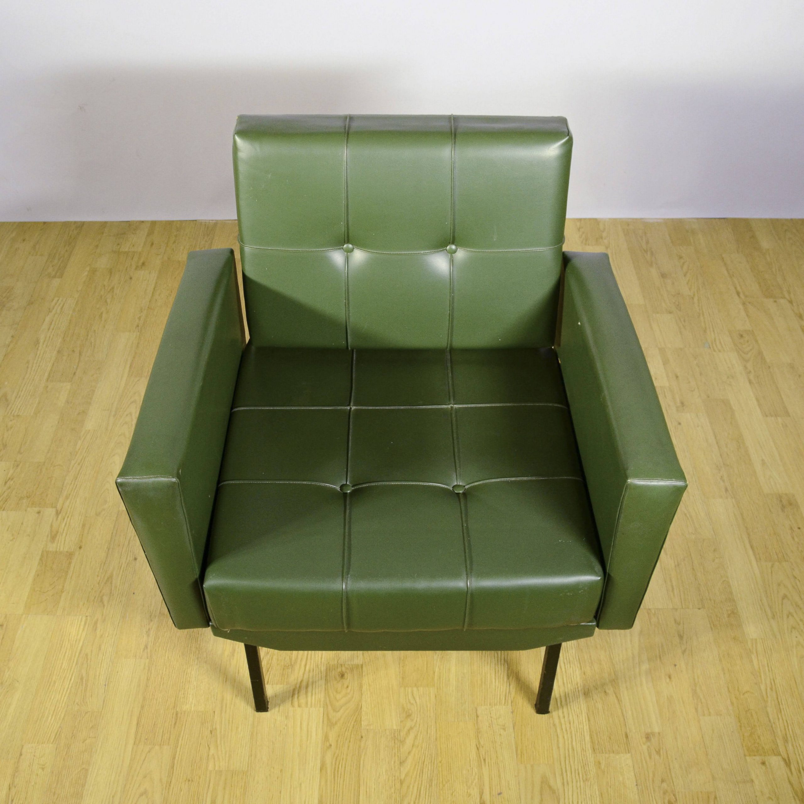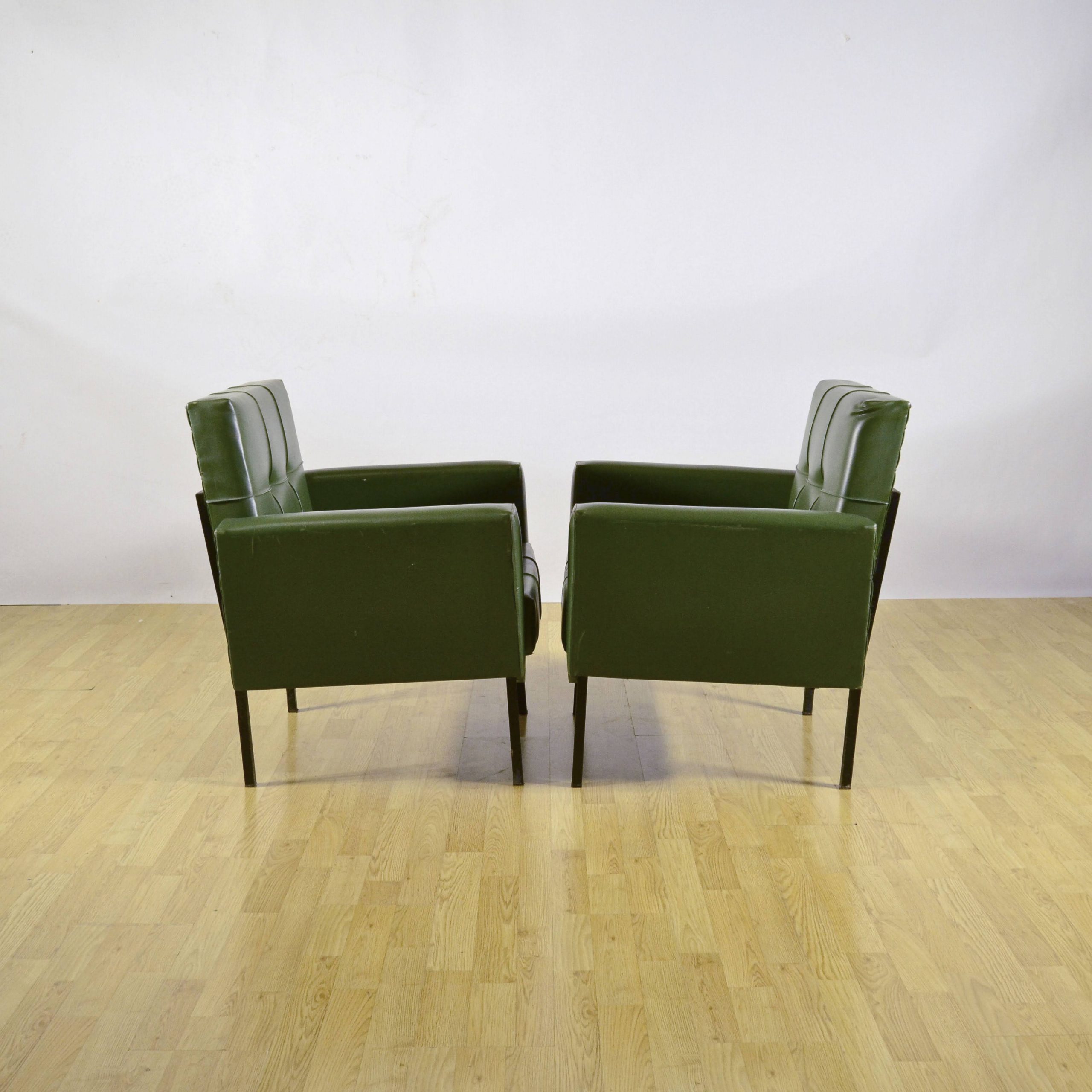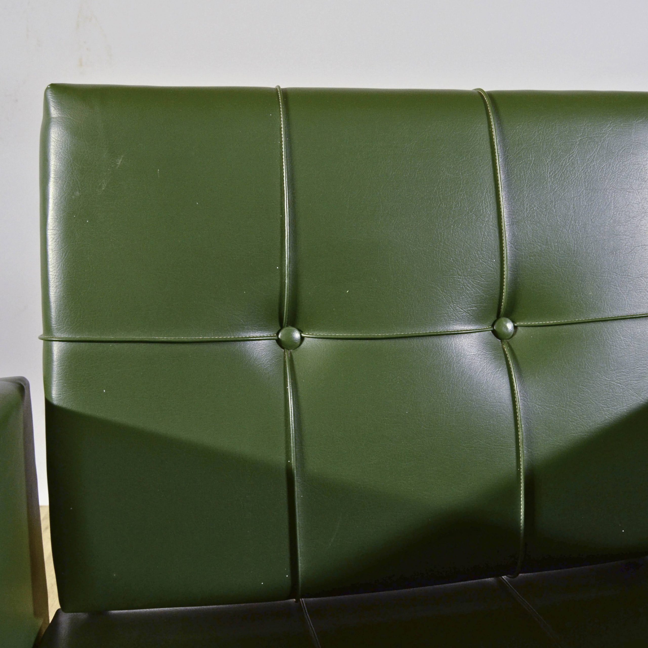 Coppia di poltrone anni ’70 caratterizzate da struttura in metallo e seduta imbottita in gommapiuma rivestita in similpelle verde. Il design dalle linee pulite e la seduta ampia e confortevole le rendono perfette per soggiorni, studi o ambienti in stile Mid-Century.