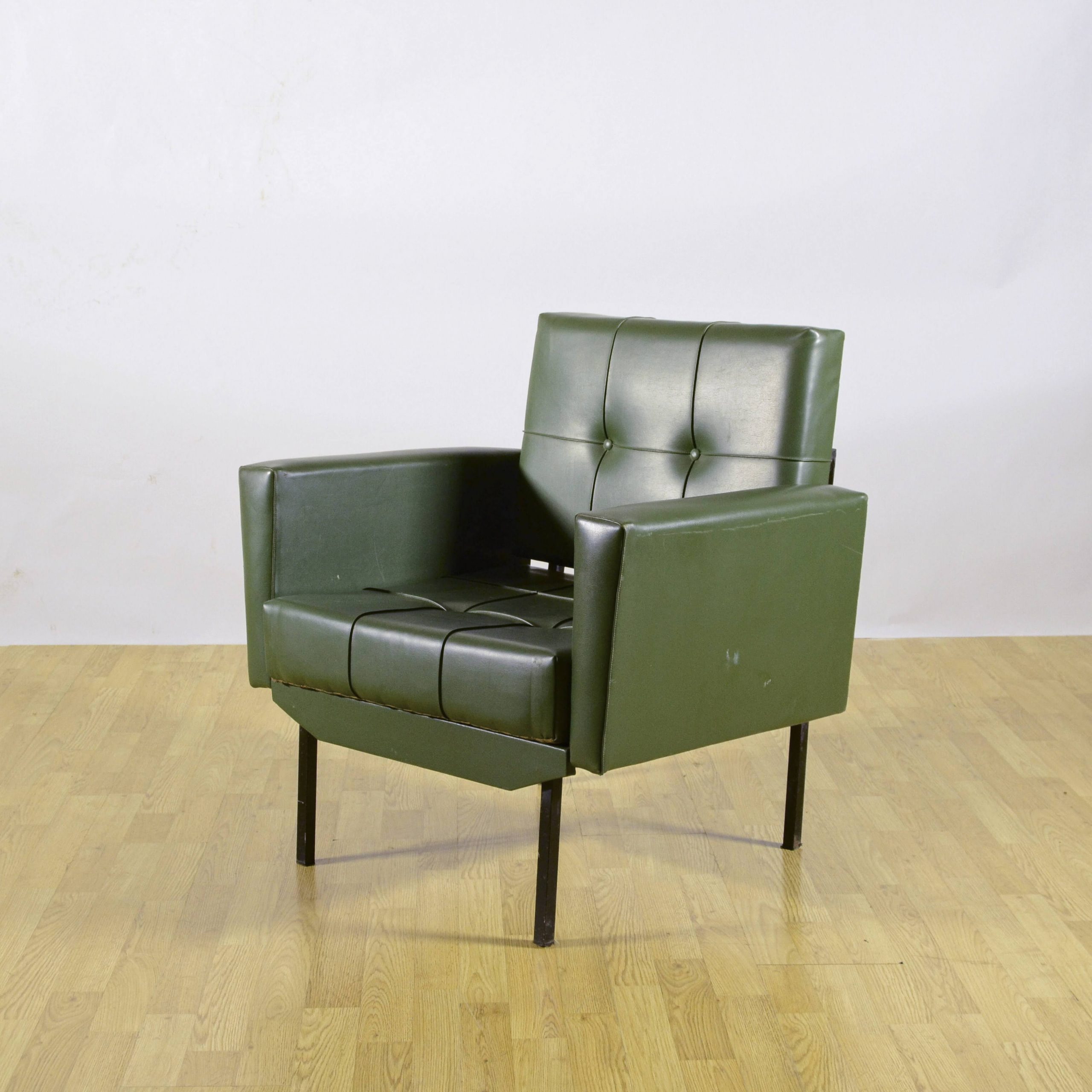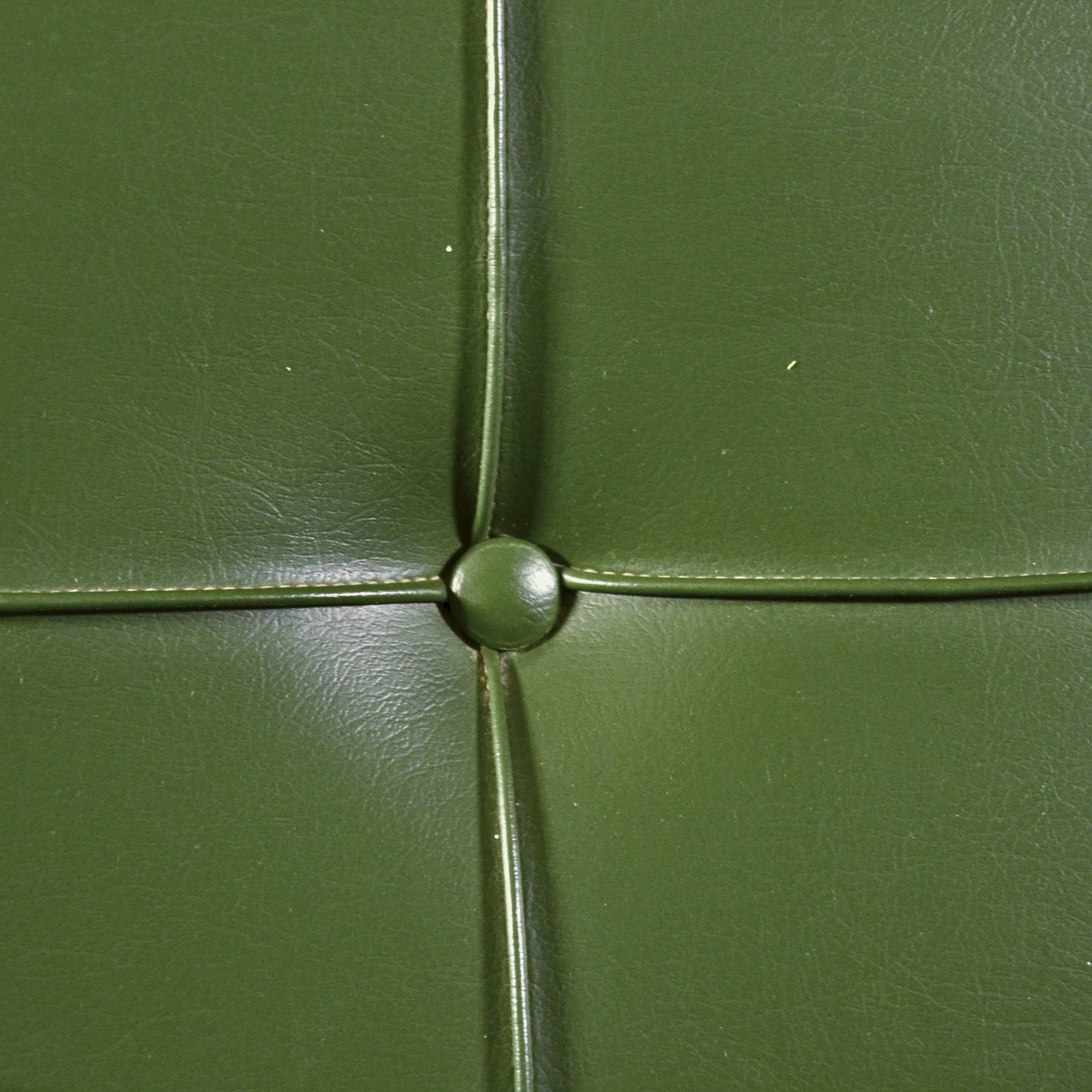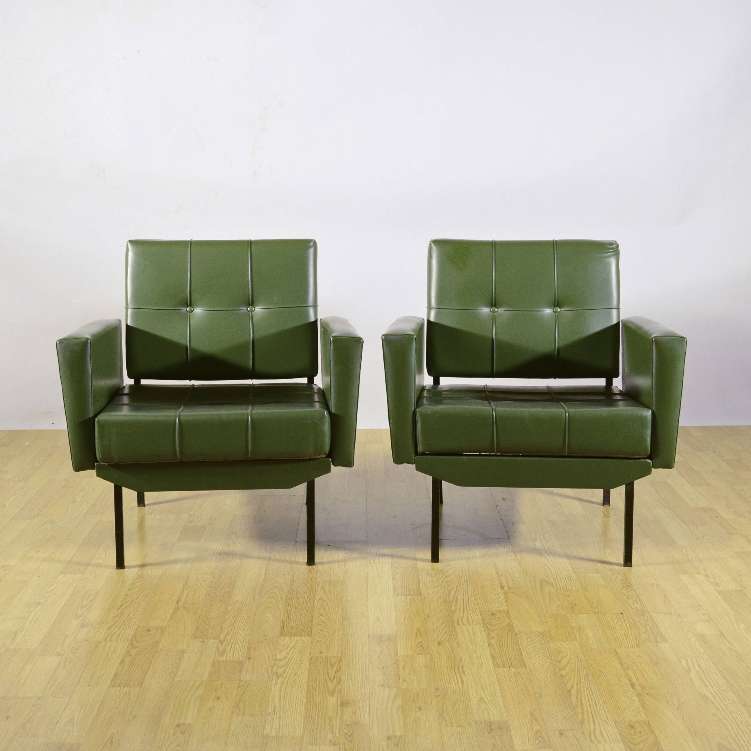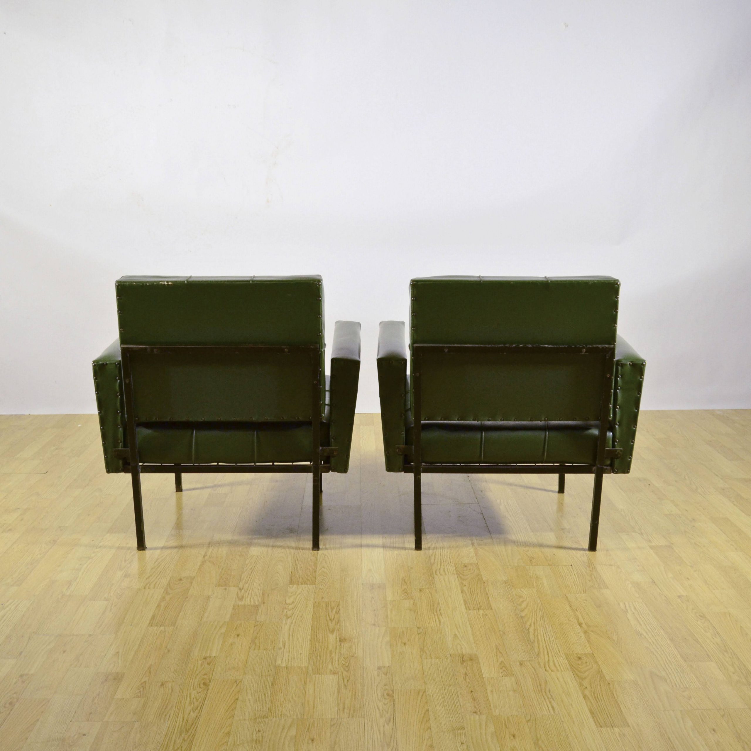 Coppia di poltrone anni ’70 caratterizzate da struttura in metallo e seduta imbottita in gommapiuma rivestita in similpelle verde. Il design dalle linee pulite e la seduta ampia e confortevole le rendono perfette per soggiorni, studi o ambienti in stile Mid-Century.