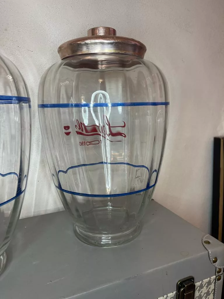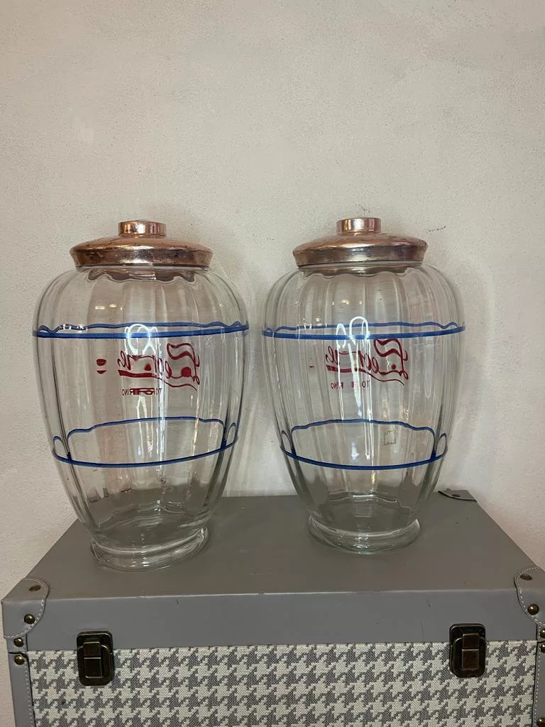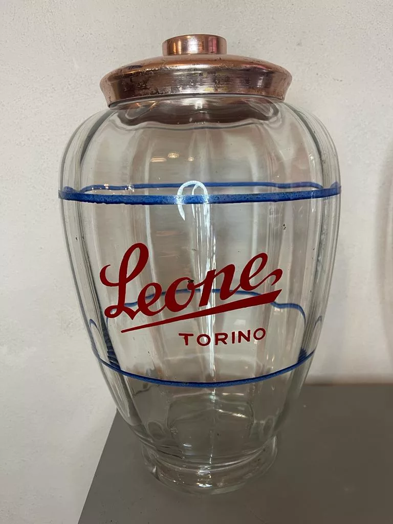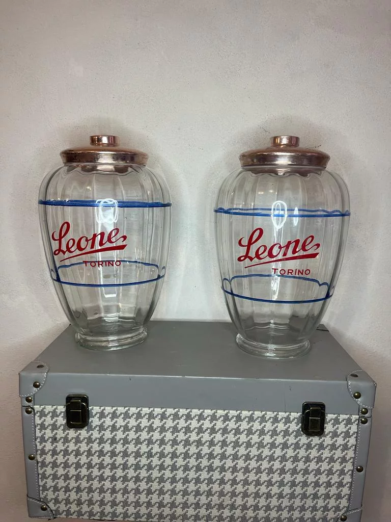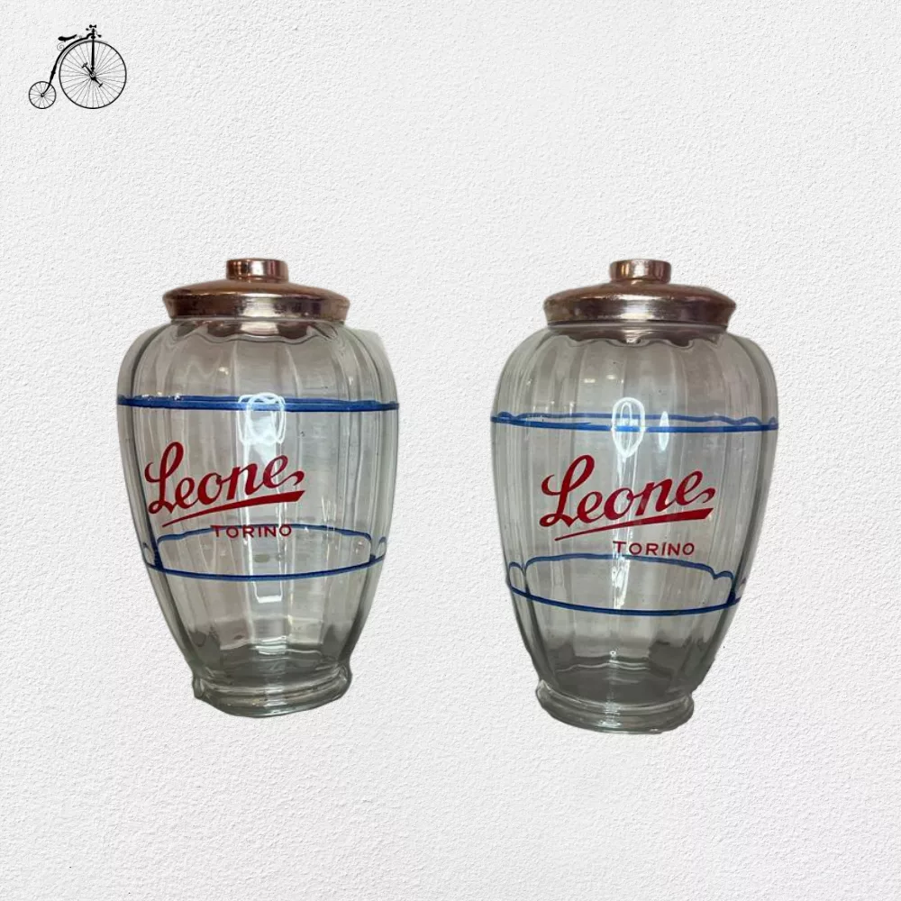 Coppia Vasi Leone, prodotti nel 1940 circa, sono dei bellissimi vasi pubblicitari in vetro delle caramelle Leone Torino, che fungono anche da dispenser.