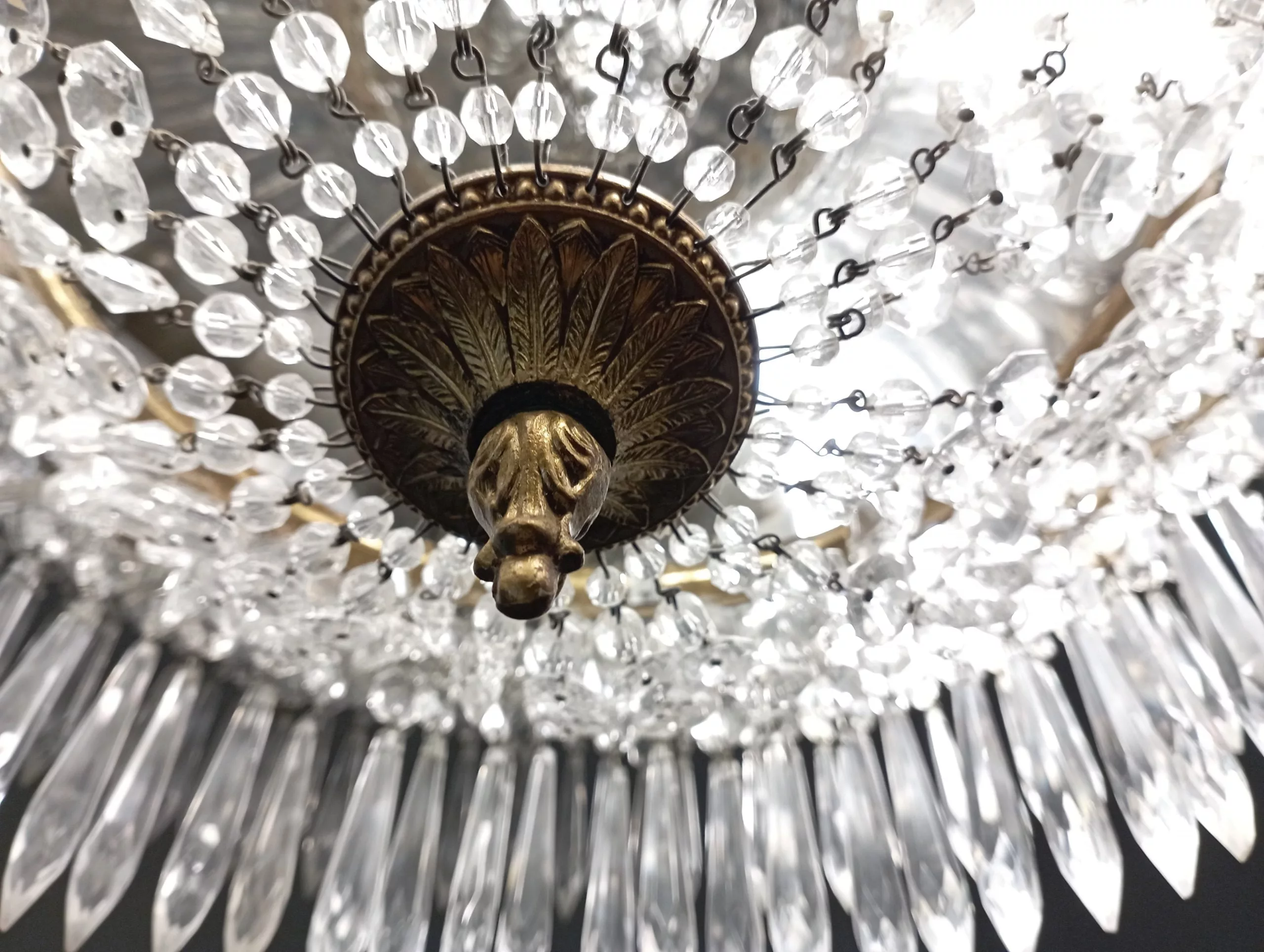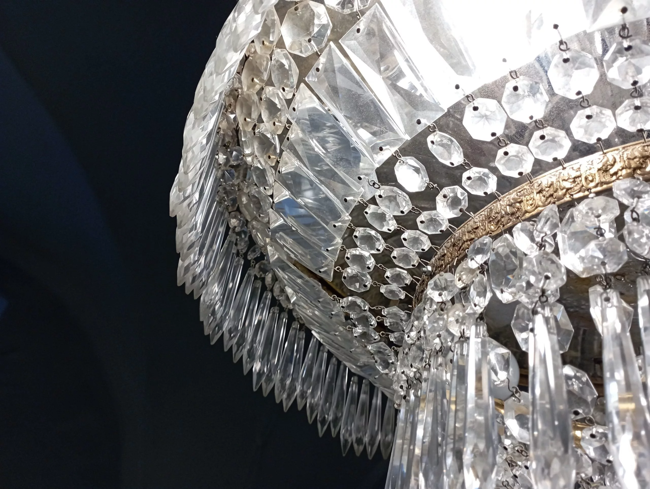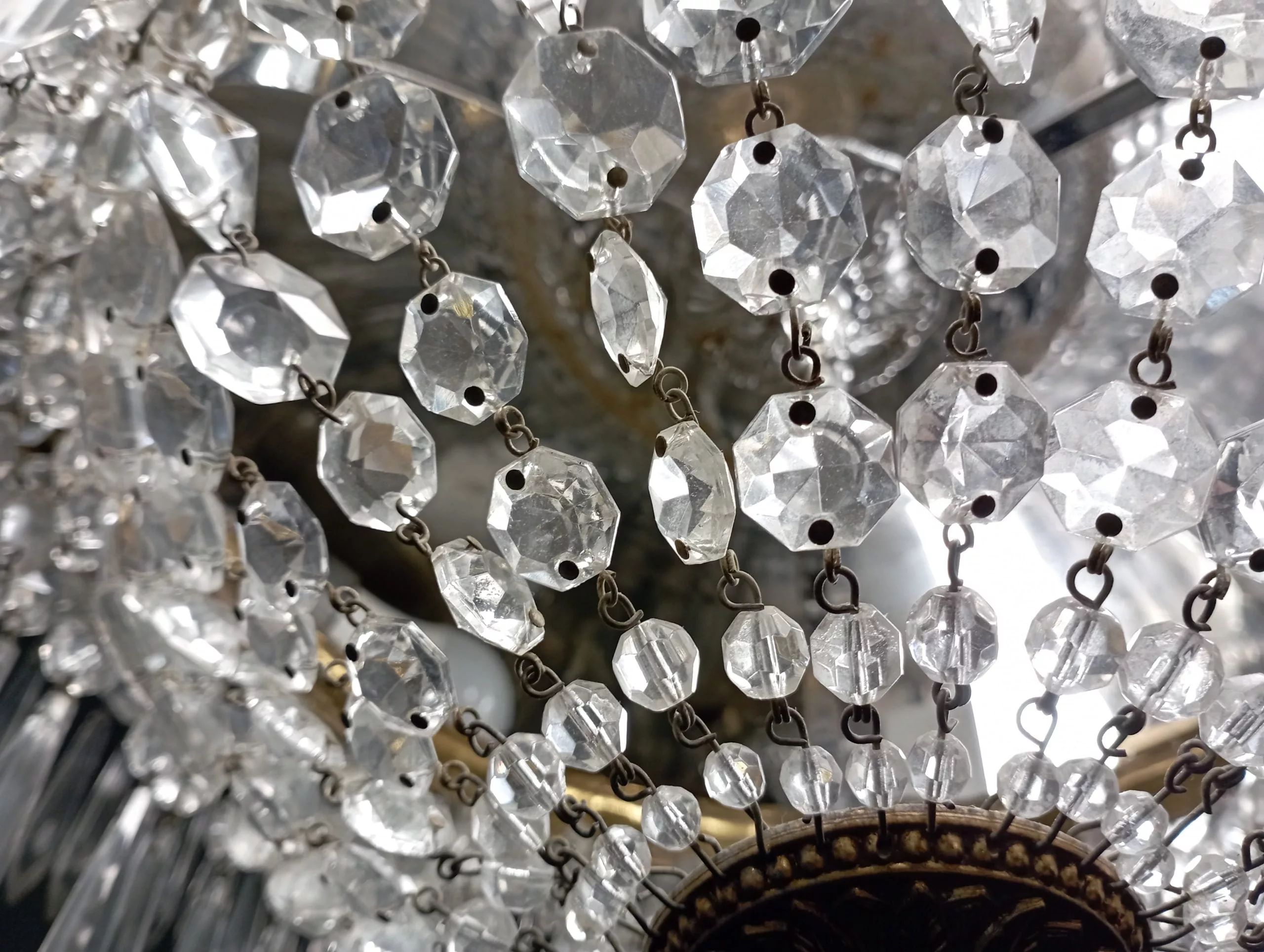 Lampadario Deco’, degli anni ’30 e riconducibile alla scuola Venini, è un elegantissimo pezzo d’arredo a 6 luci, con cristalli veneziani e con profili in ottone decorato a tema classico.