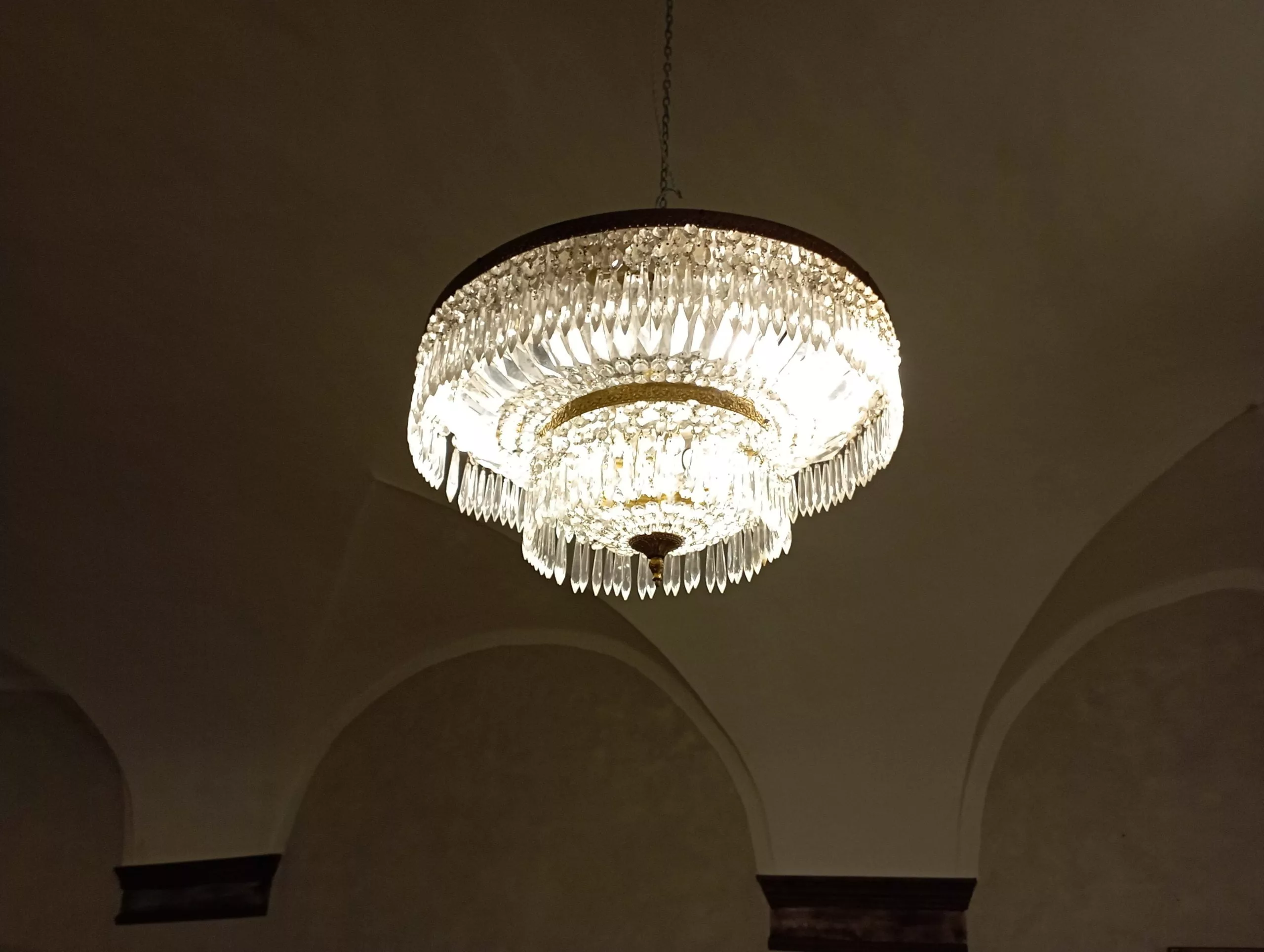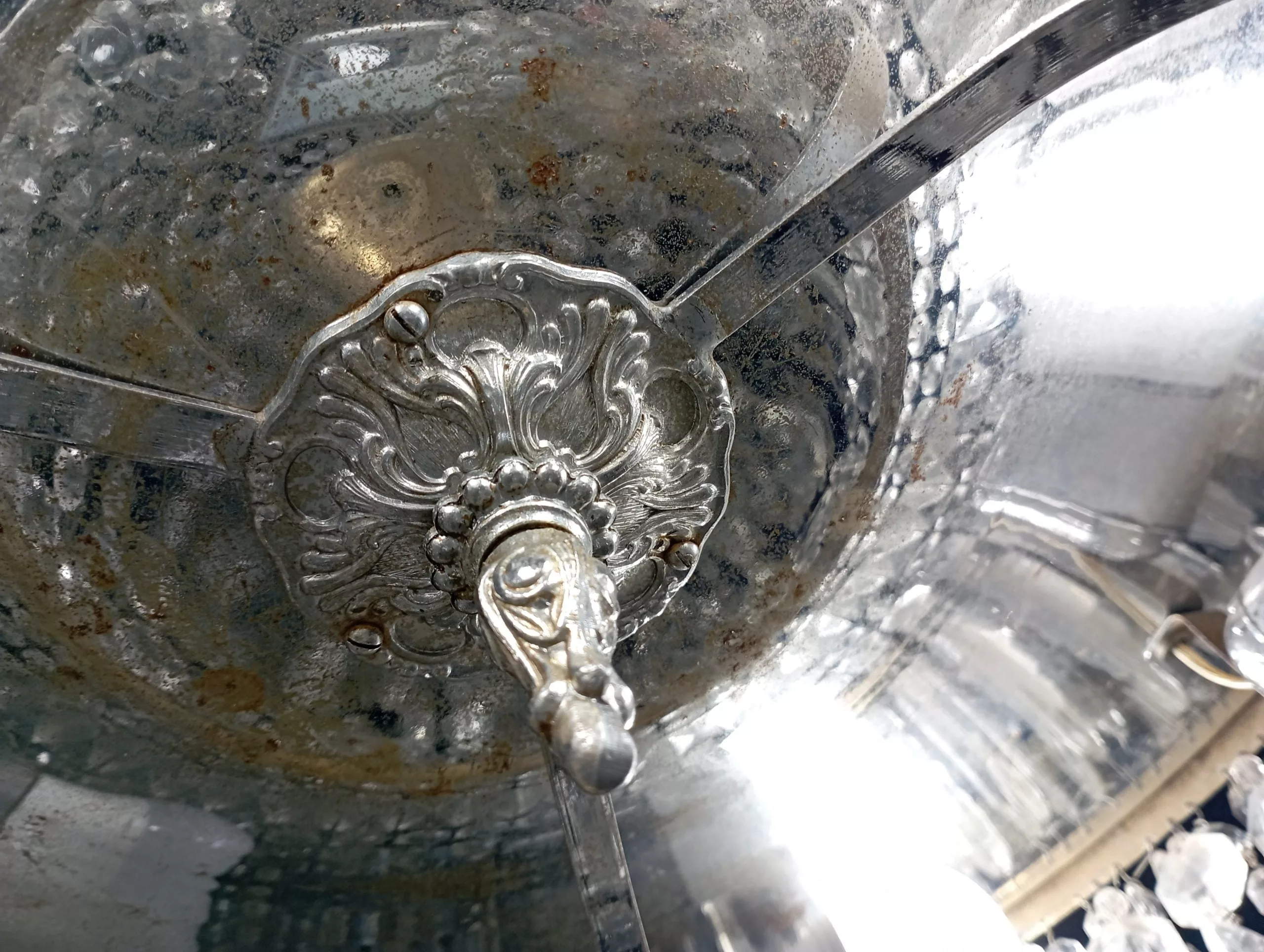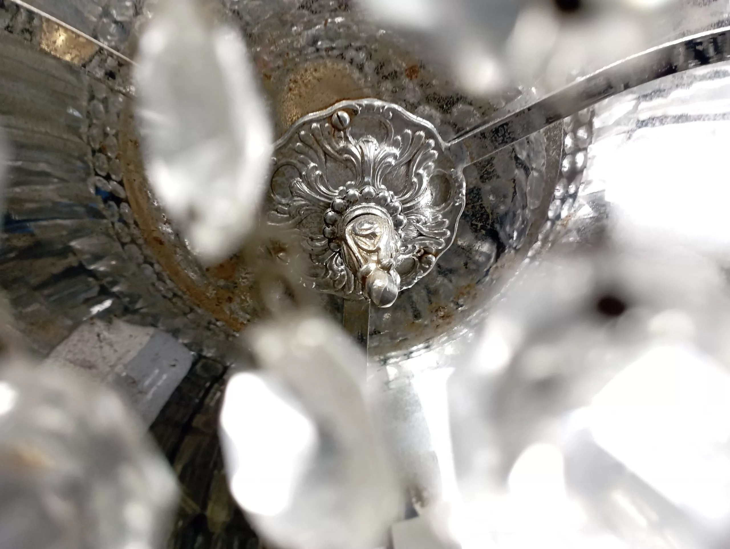 Lampadario Deco’, degli anni ’30 e riconducibile alla scuola Venini, è un elegantissimo pezzo d’arredo a 6 luci, con cristalli veneziani e con profili in ottone decorato a tema classico.
