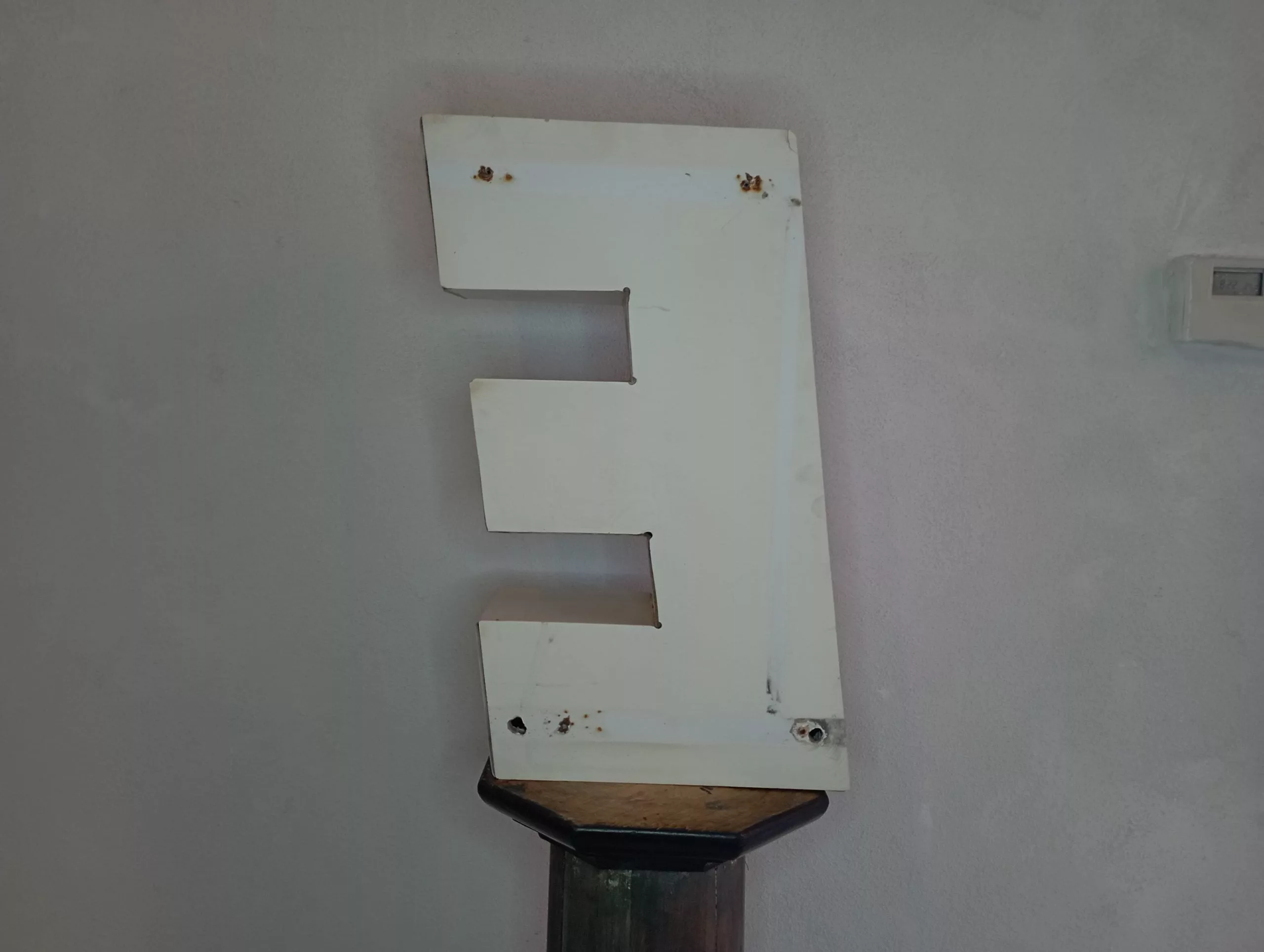 Lettera “E” in Plastica, anni ’80 circa, molto probabilmente di qualche insegna pubblicitaria, predisposta all’illuminazione.