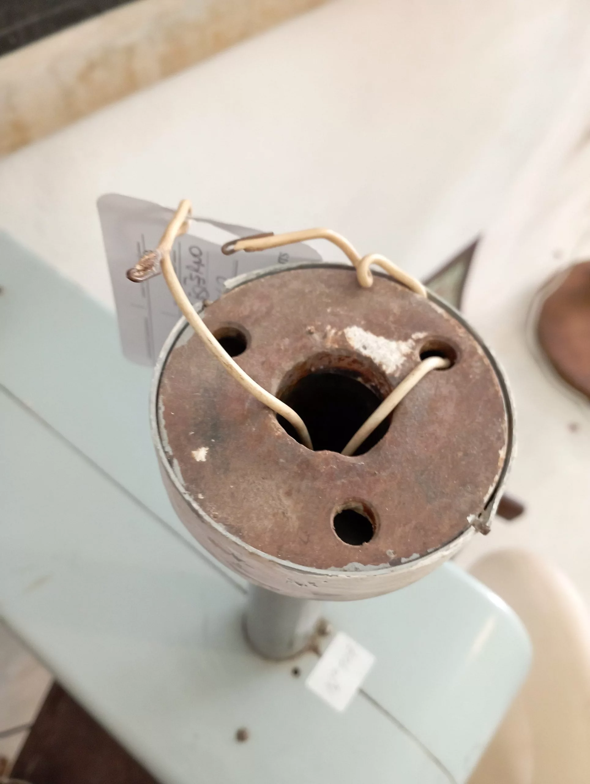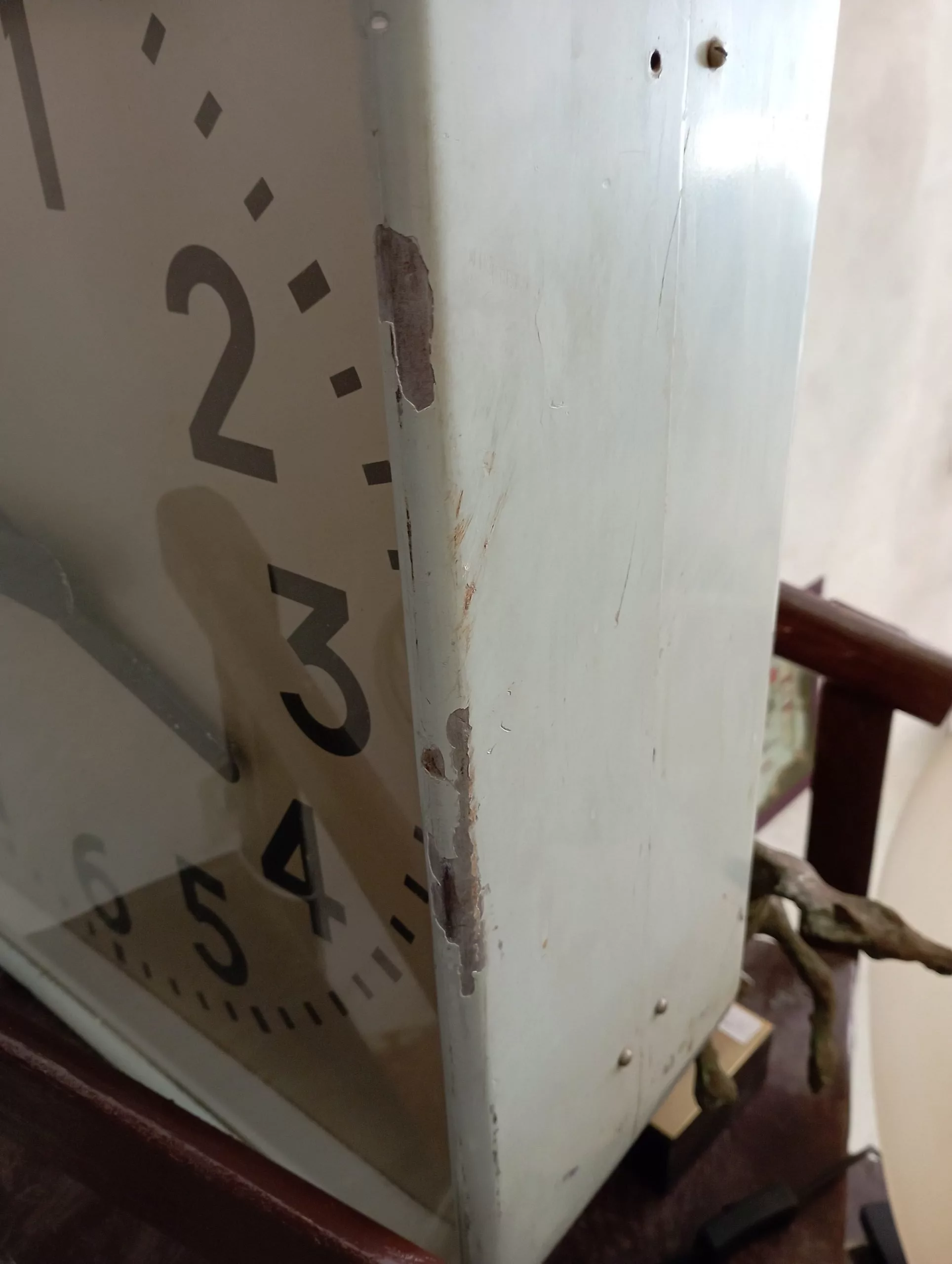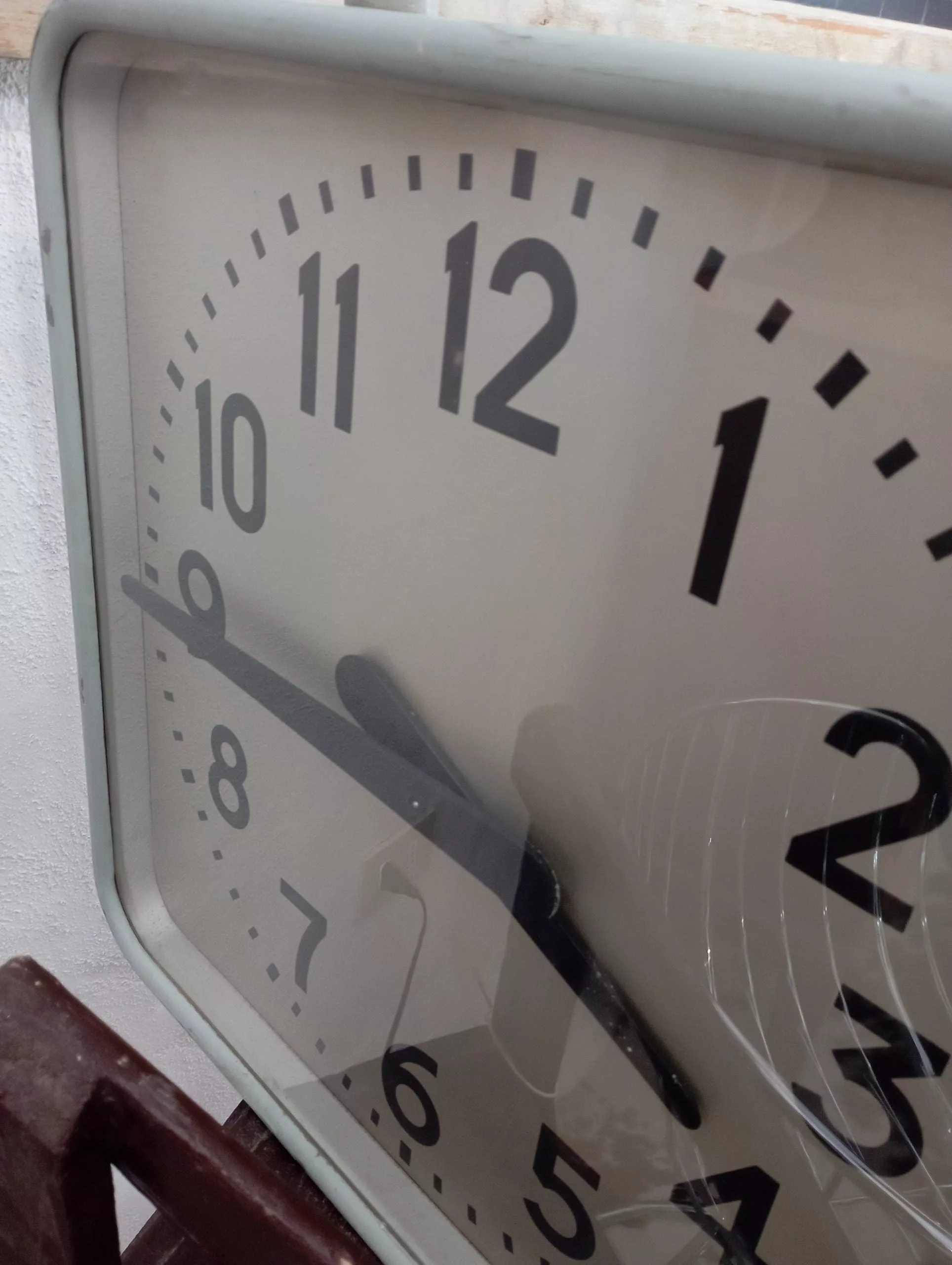 Orologio gigante bifacciale degli anni ’40, molto probabilmente situato in una stazione ferroviaria o un edificio pubblico.