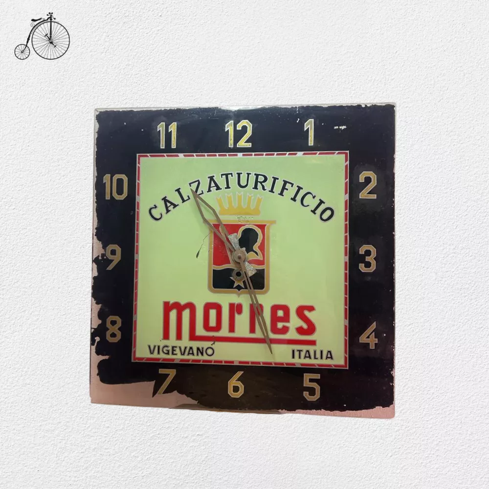 Orologio “Morres”, anni ’50, è un orologio da parete pubblicitario, in vetro serigrafato perfettamente funzionante e con piccoli segni di usura.