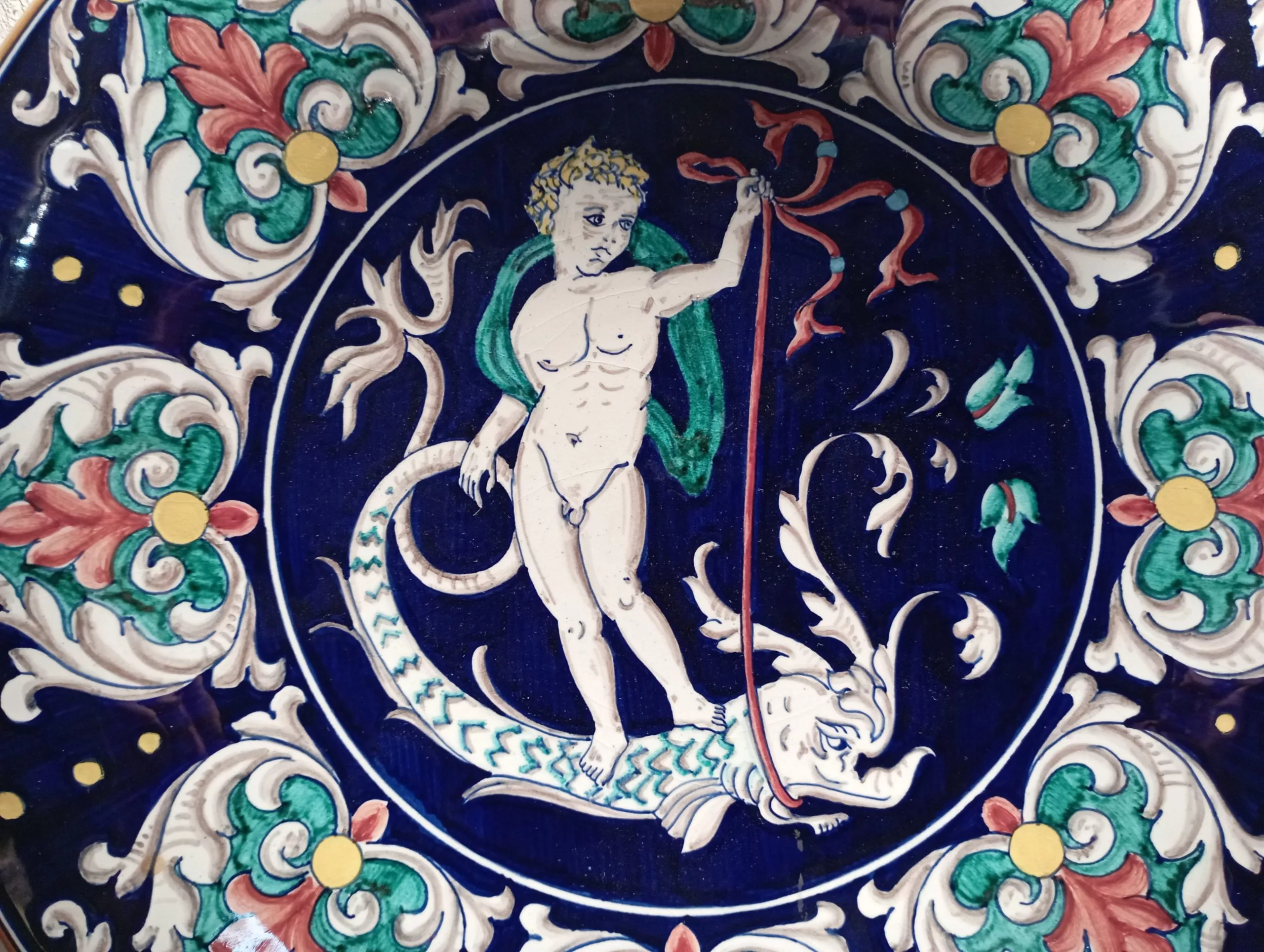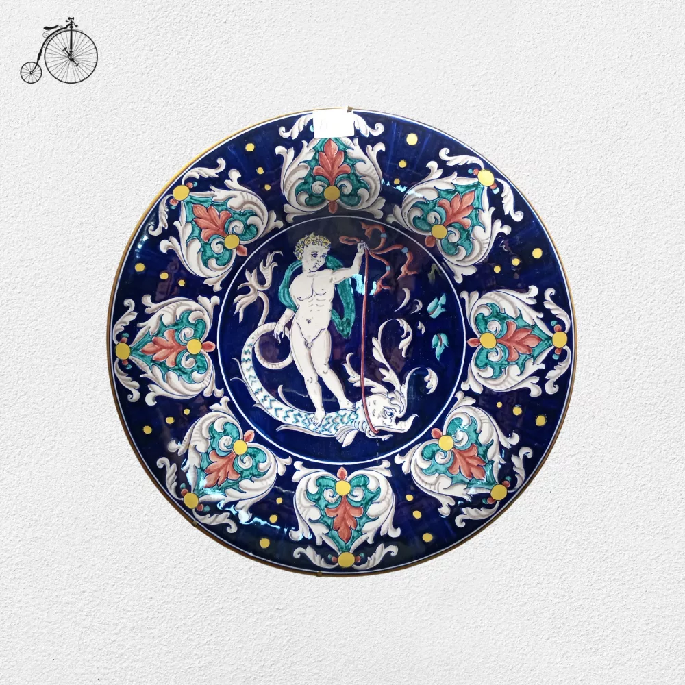 Piatto Deruta Putto in ceramica interamente dipinto a mano, con la raffigurazione di Putto, circondato da un bordo con intricati motivi floreali.