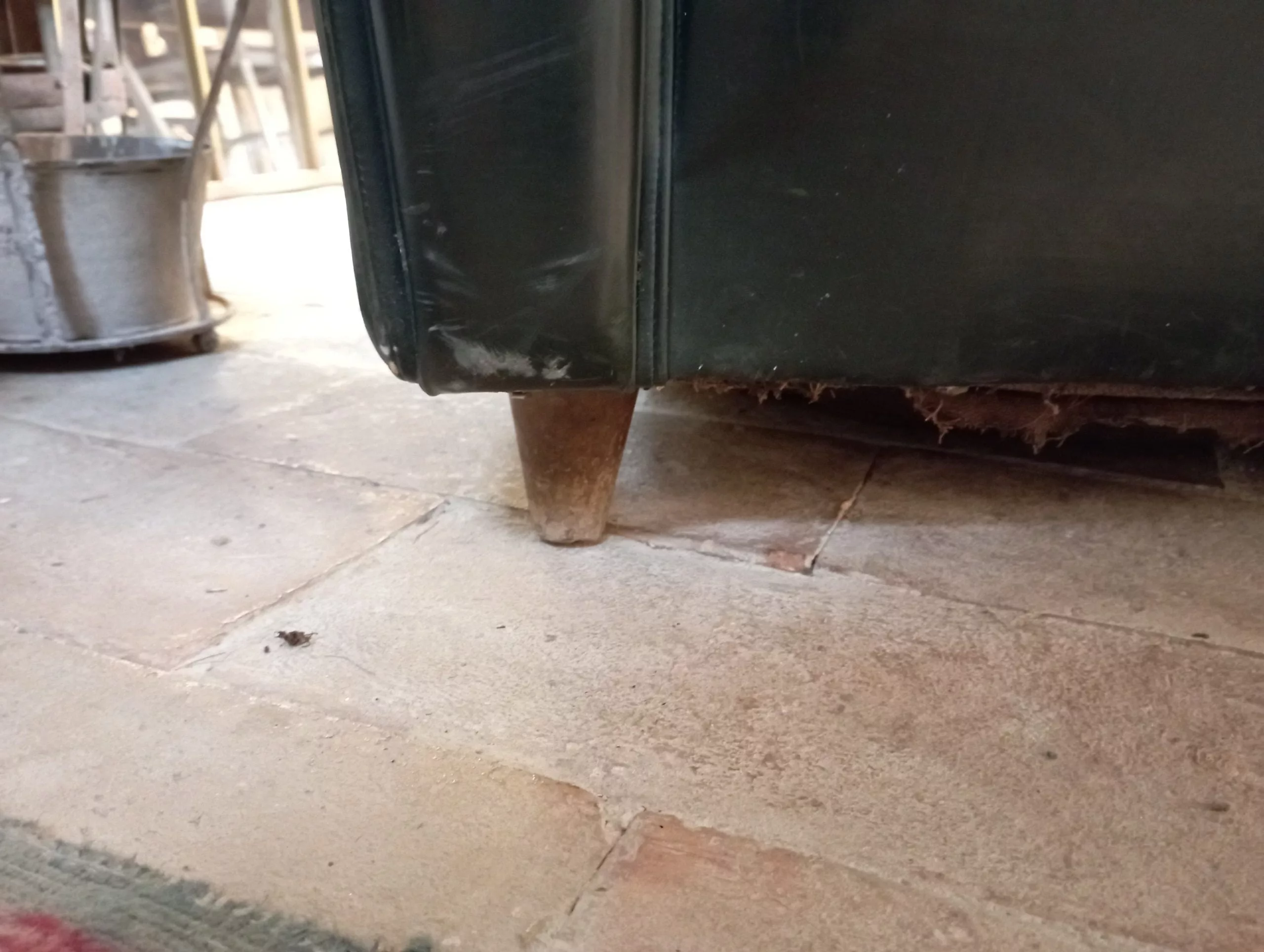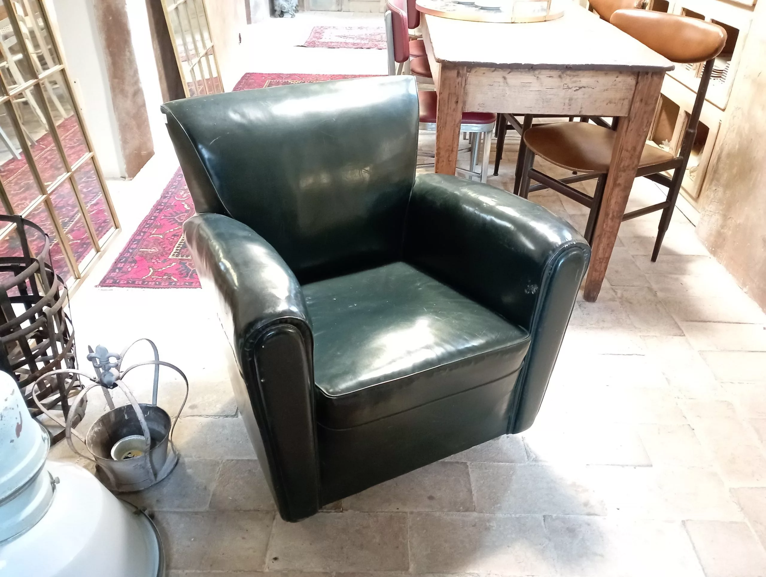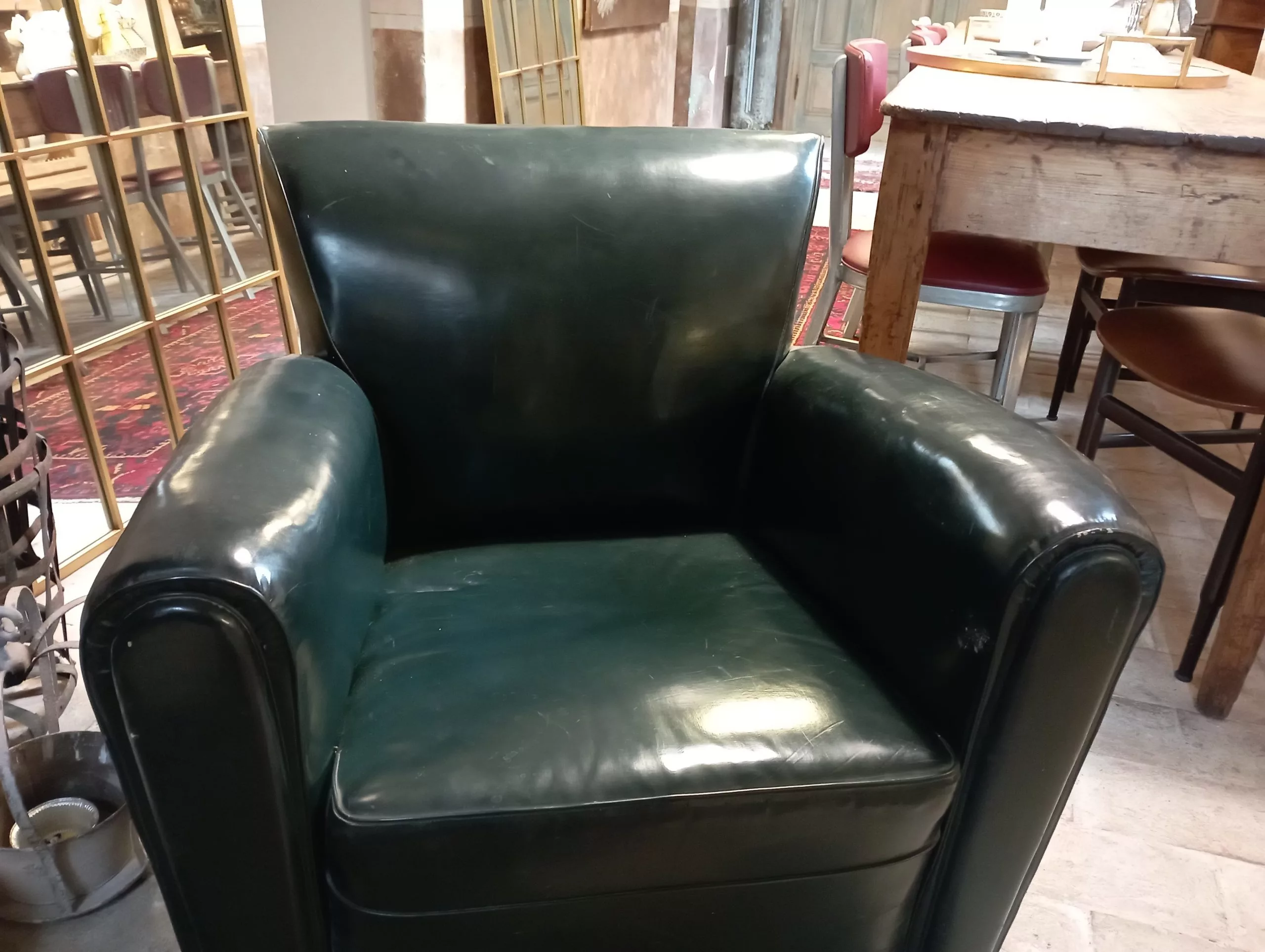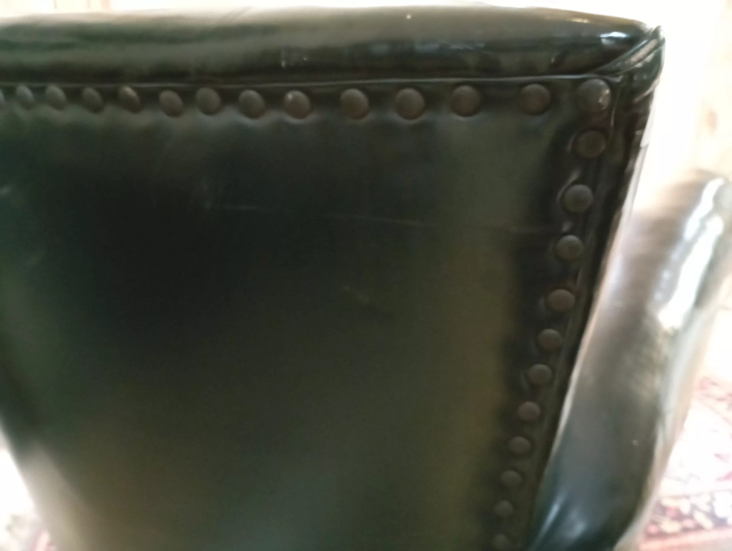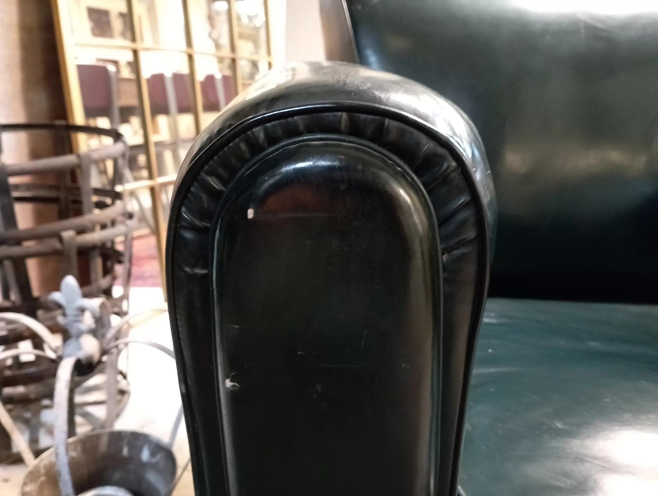 Poltrona Ministeriale da ufficio in pelle finta color verde scuro. Elegante e comoda grazie al suo stile avvolgente degli anni ’30.