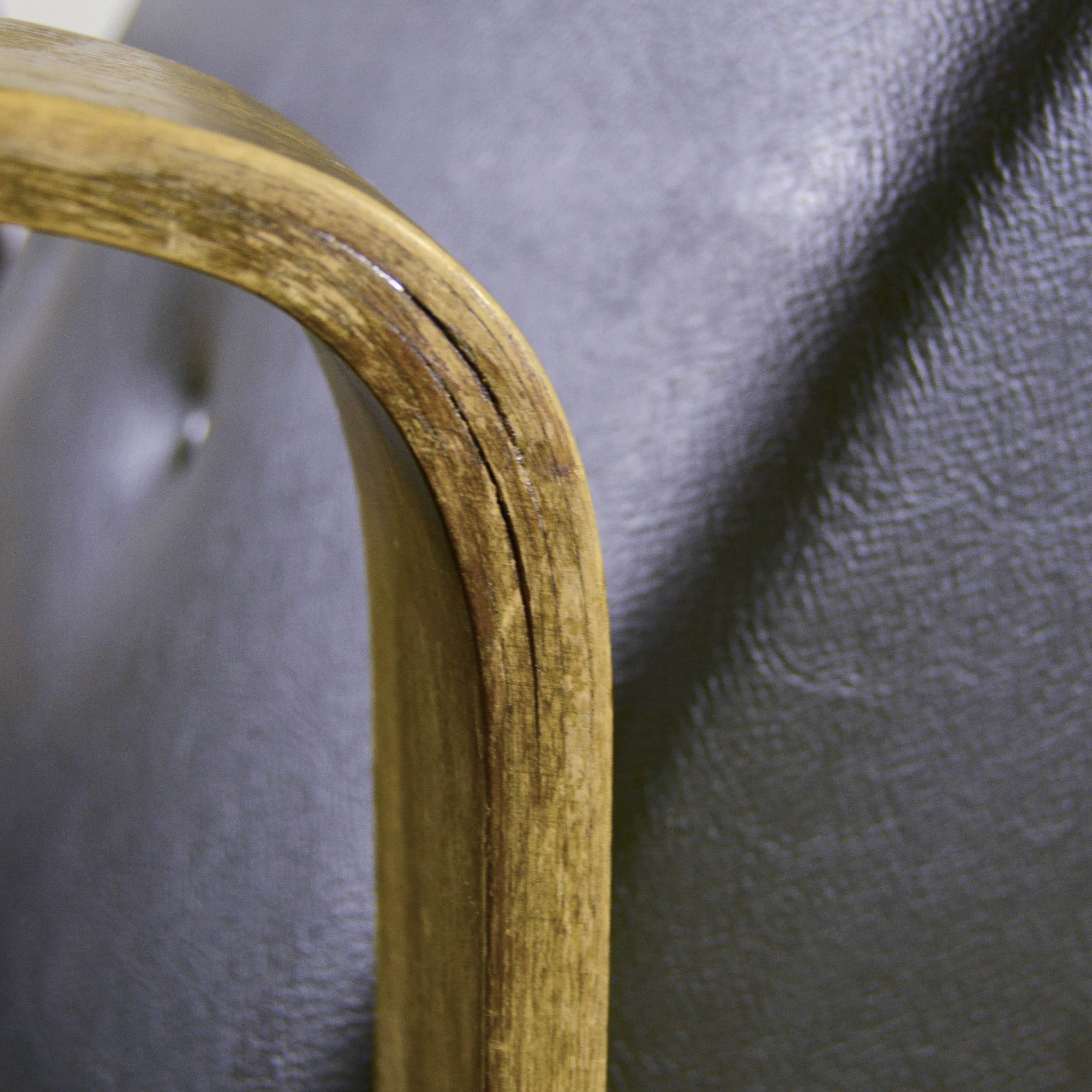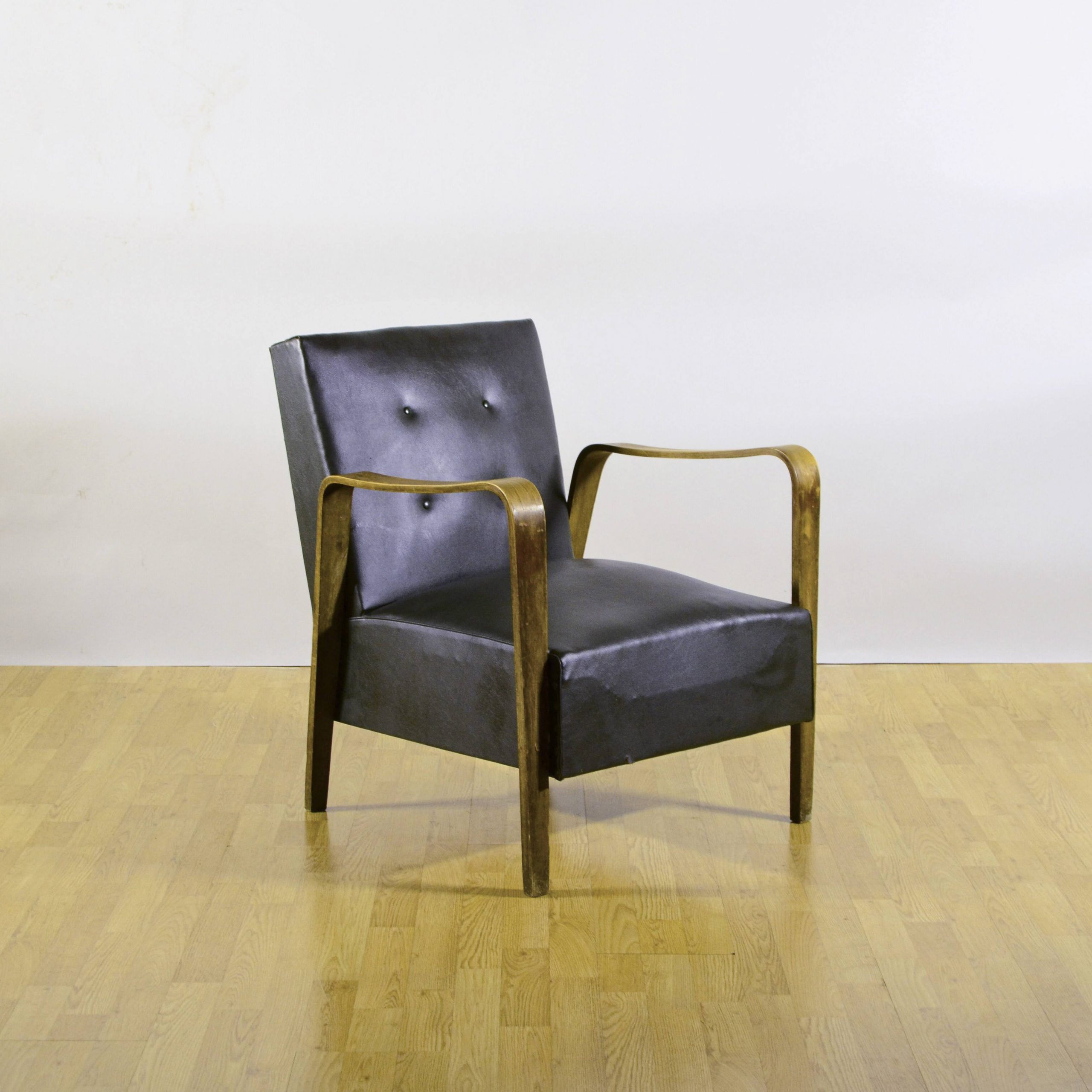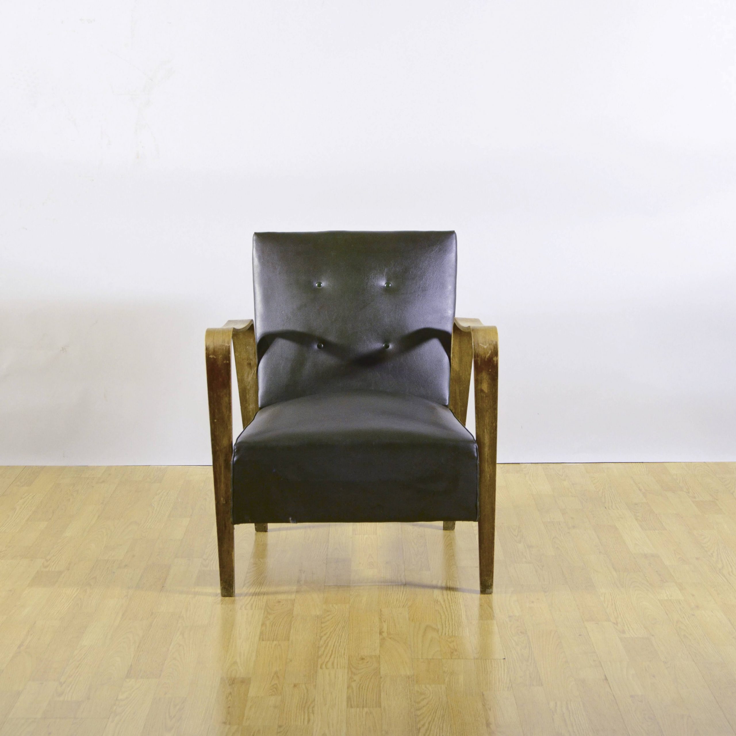 Poltrona anni ’40 di Anonima Castelli in pelle verde scuro con elegante struttura in legno curvato. Il design essenziale è valorizzato dai braccioli sinuosi e dallo schienale leggermente inclinato con bottoni decorativi, che conferiscono carattere e comfort.