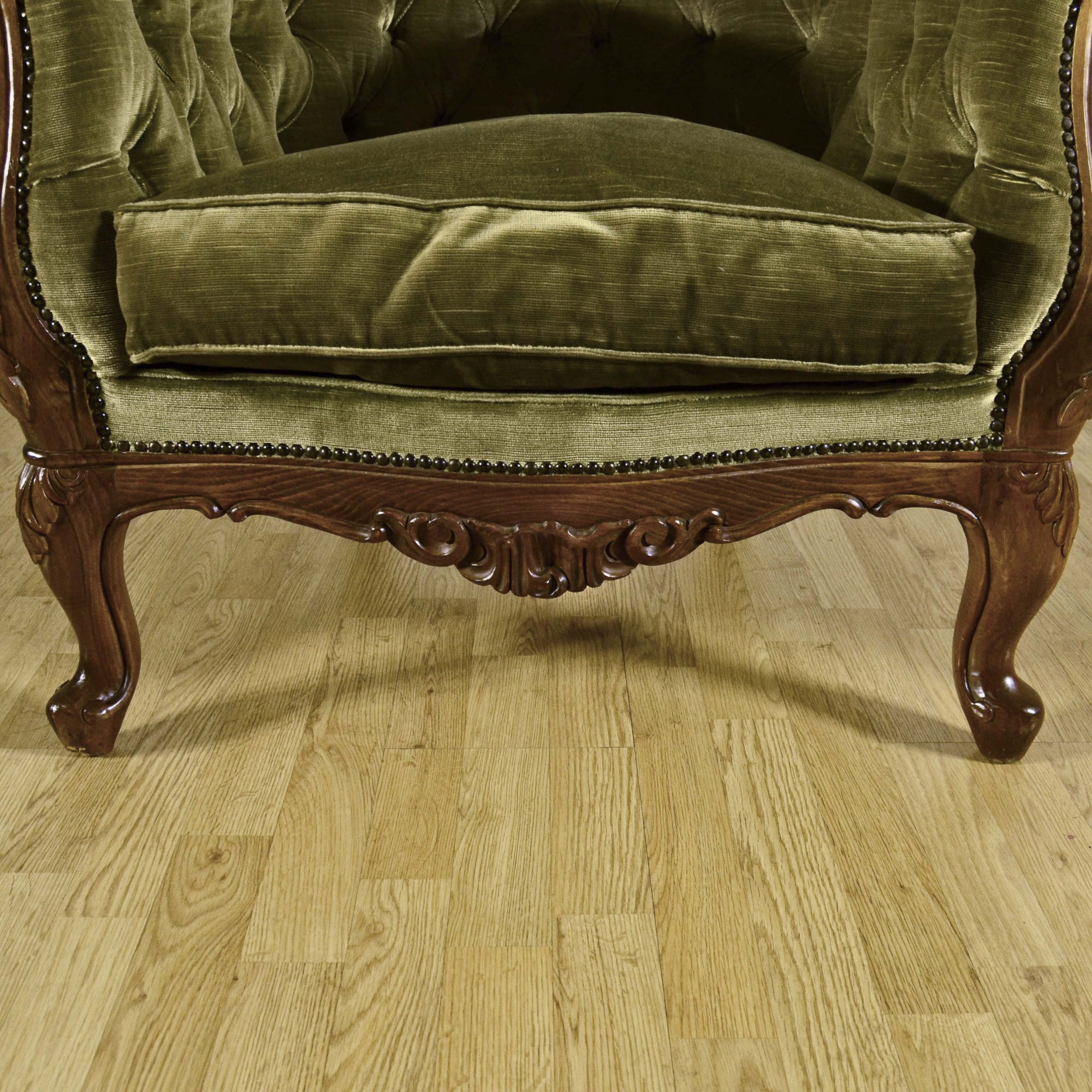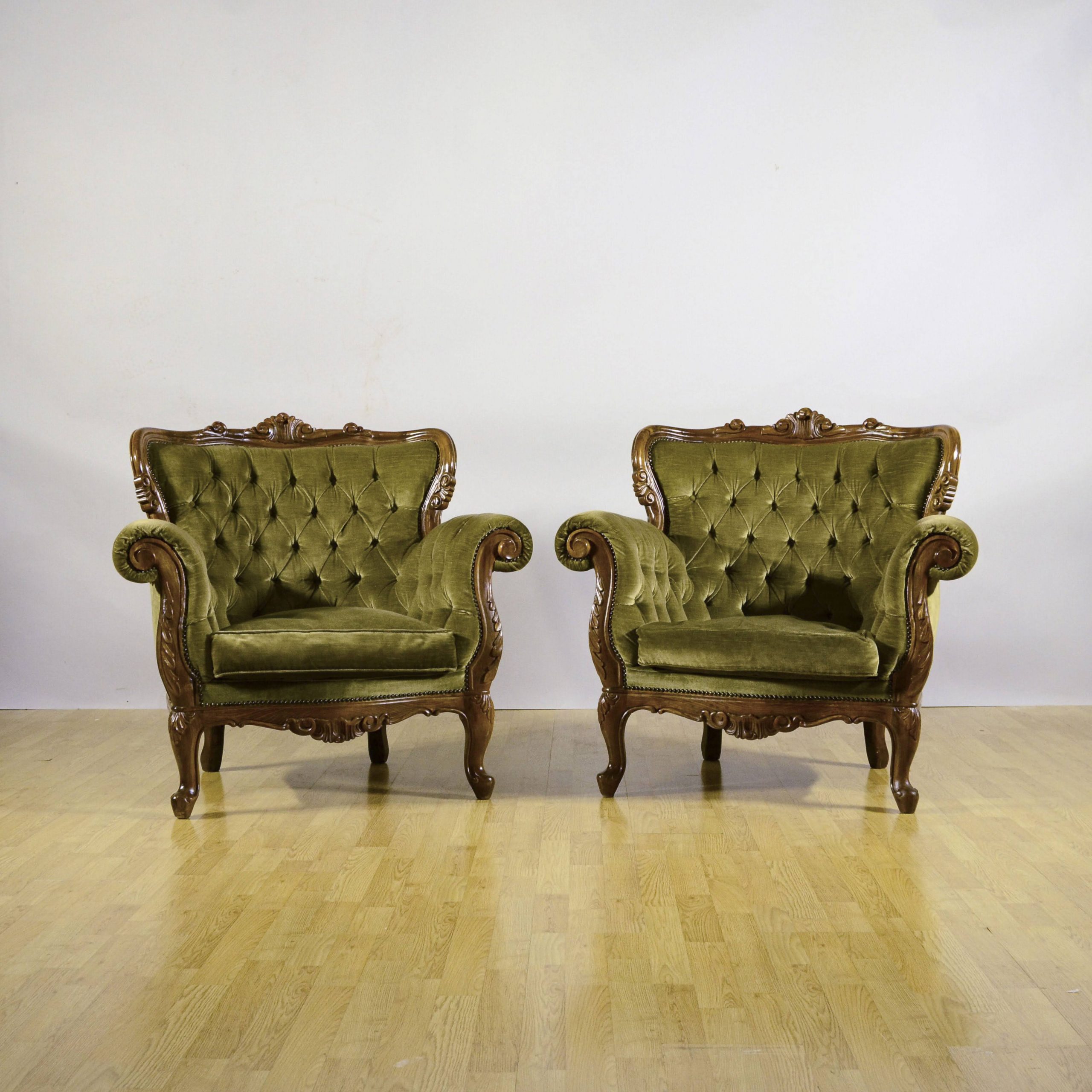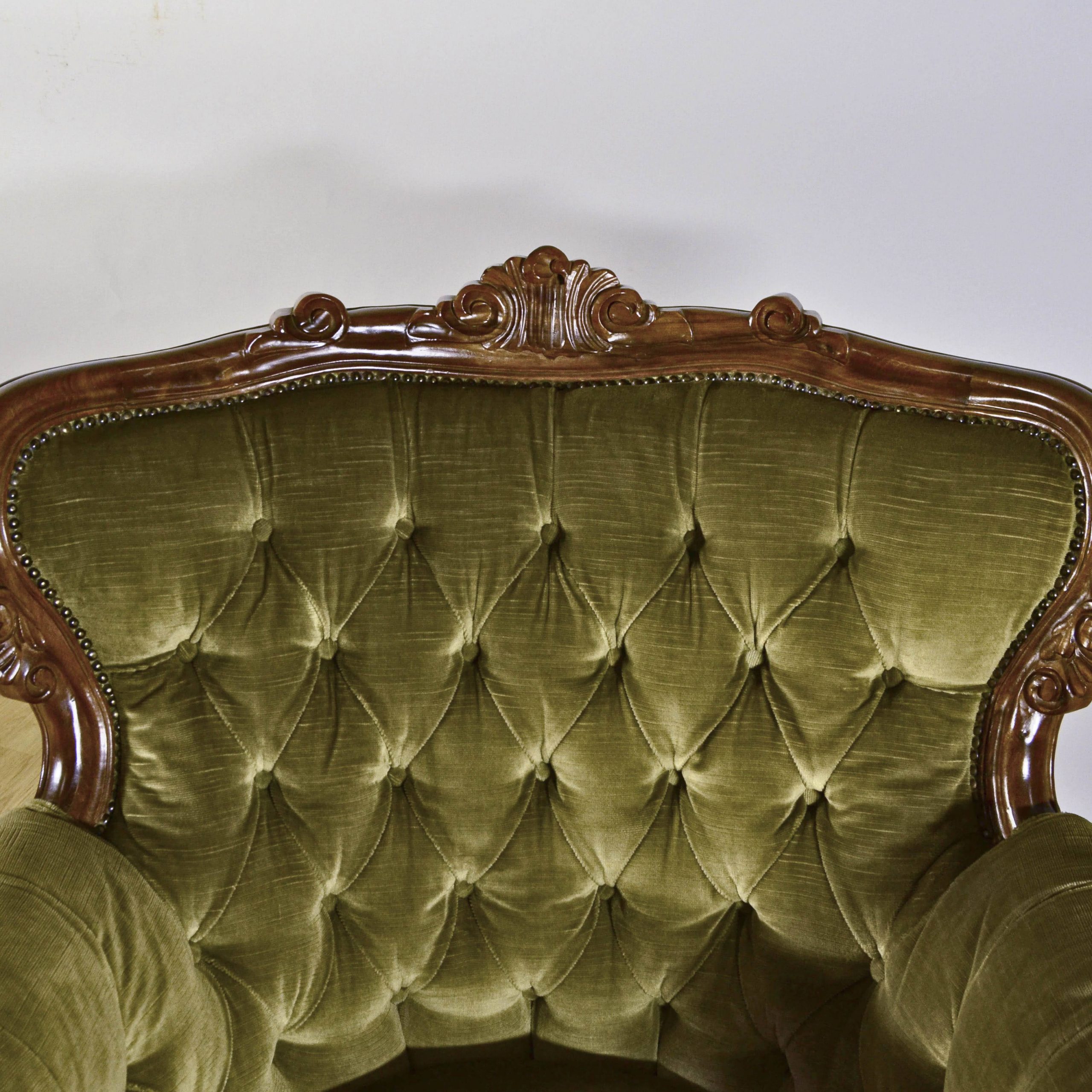 Raffinata coppia di poltrone capitonné stile Luigi Filippo, databili alla fine dell’800, caratterizzate da una solida struttura in legno finemente intagliato e da un elegante rivestimento in velluto verde.
