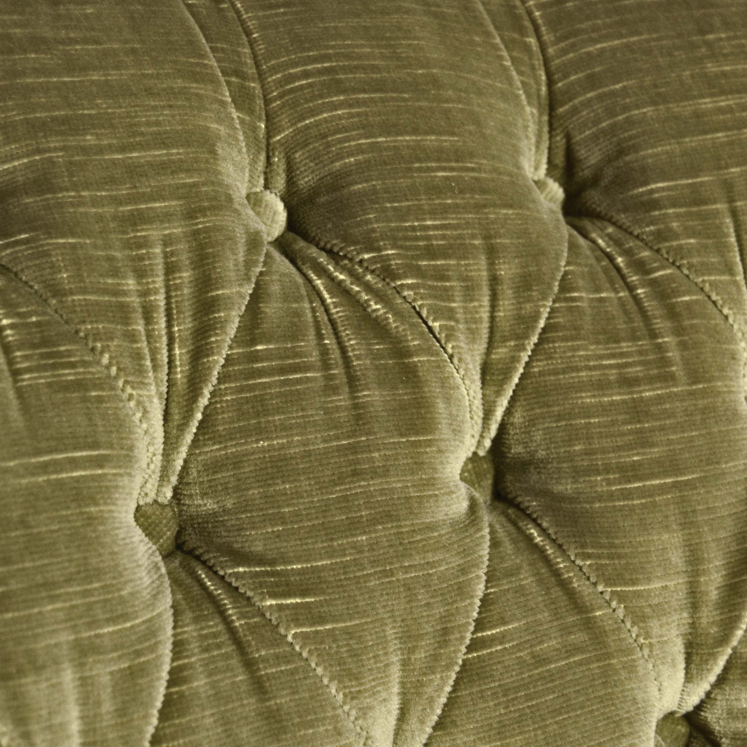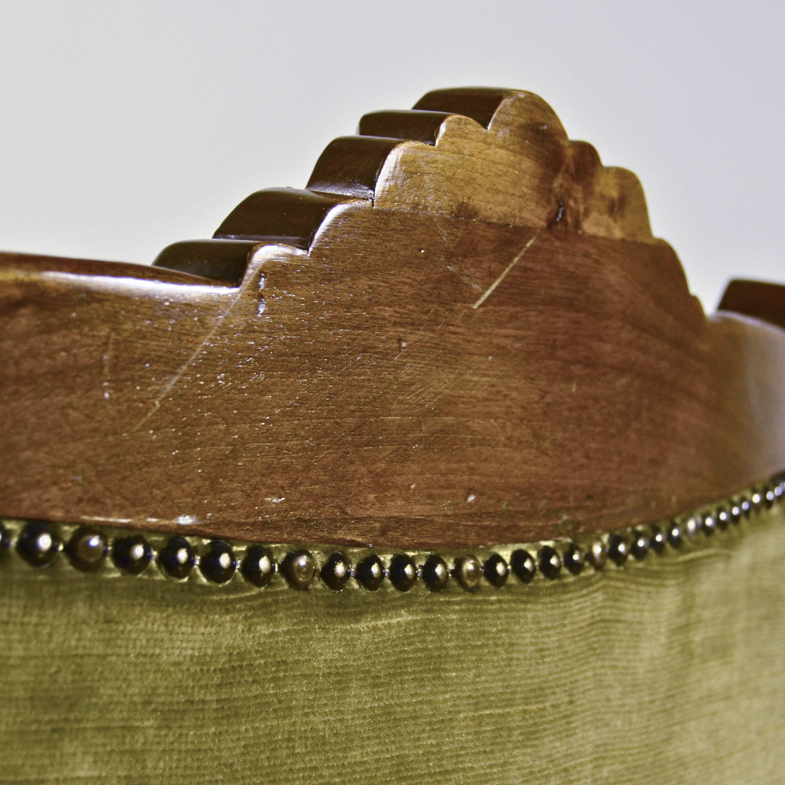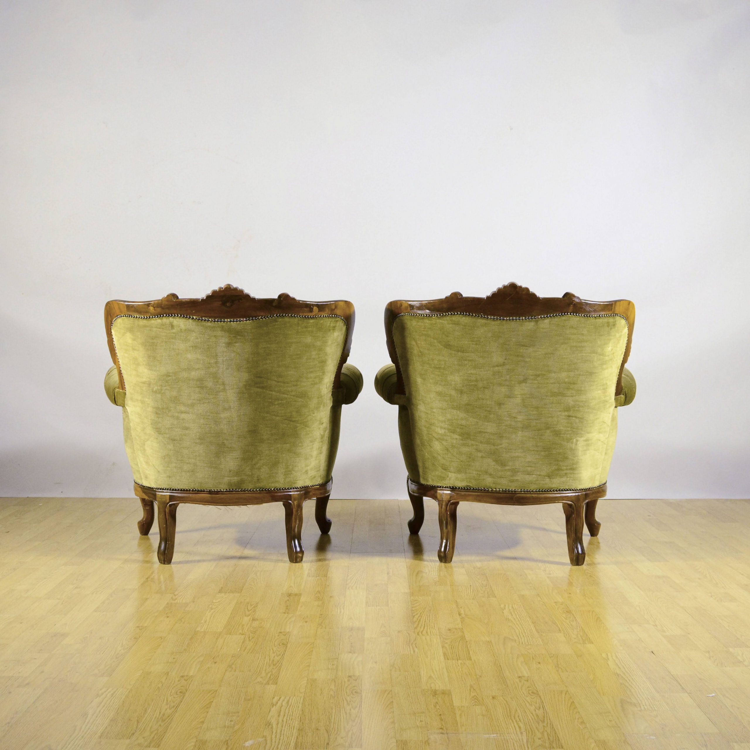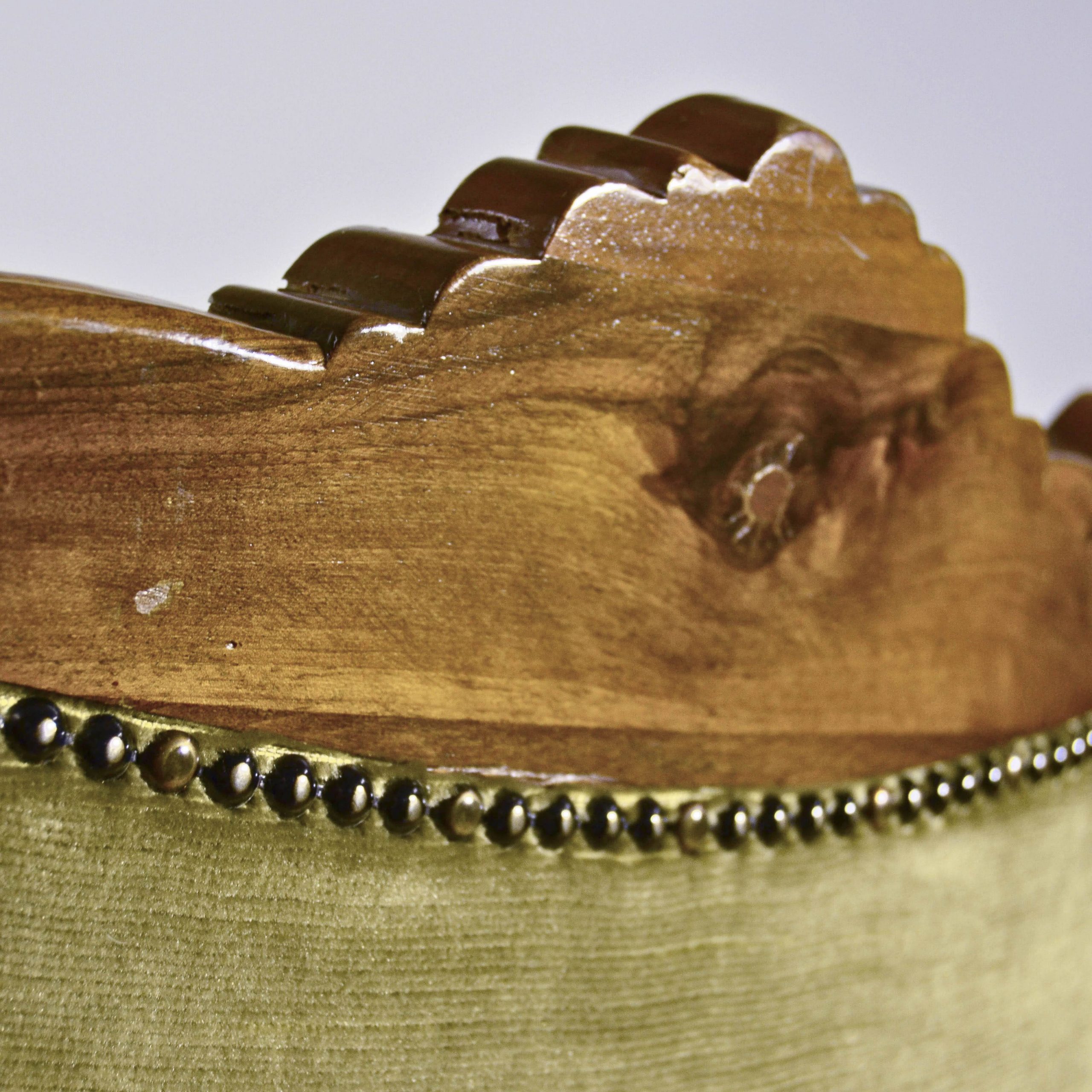 Raffinata coppia di poltrone capitonné stile Luigi Filippo, databili alla fine dell’800, caratterizzate da una solida struttura in legno finemente intagliato e da un elegante rivestimento in velluto verde.