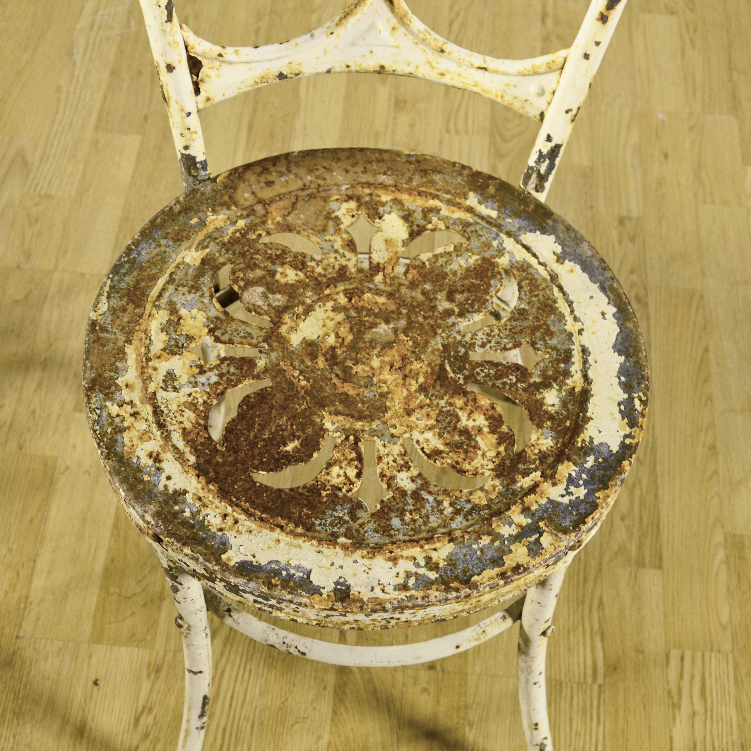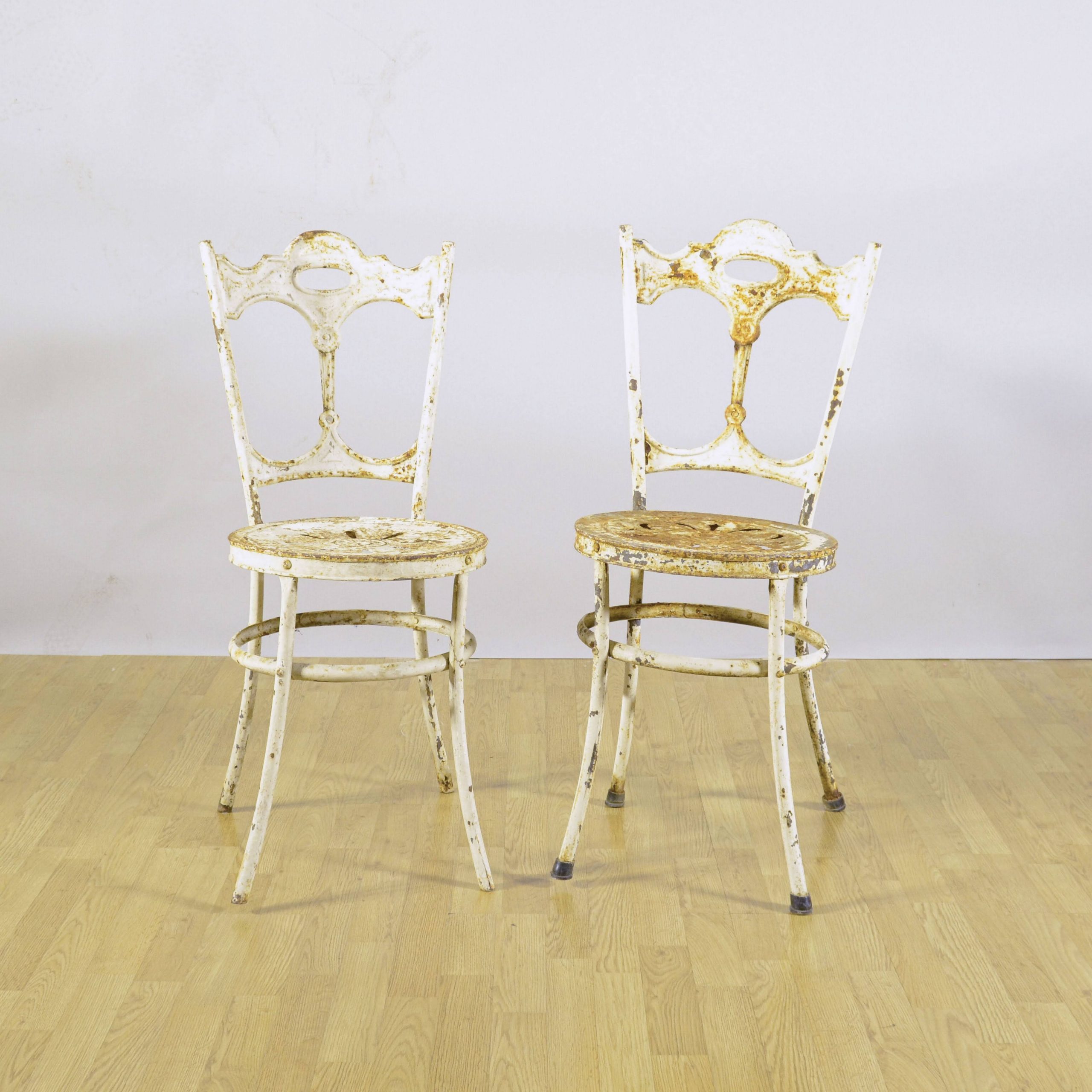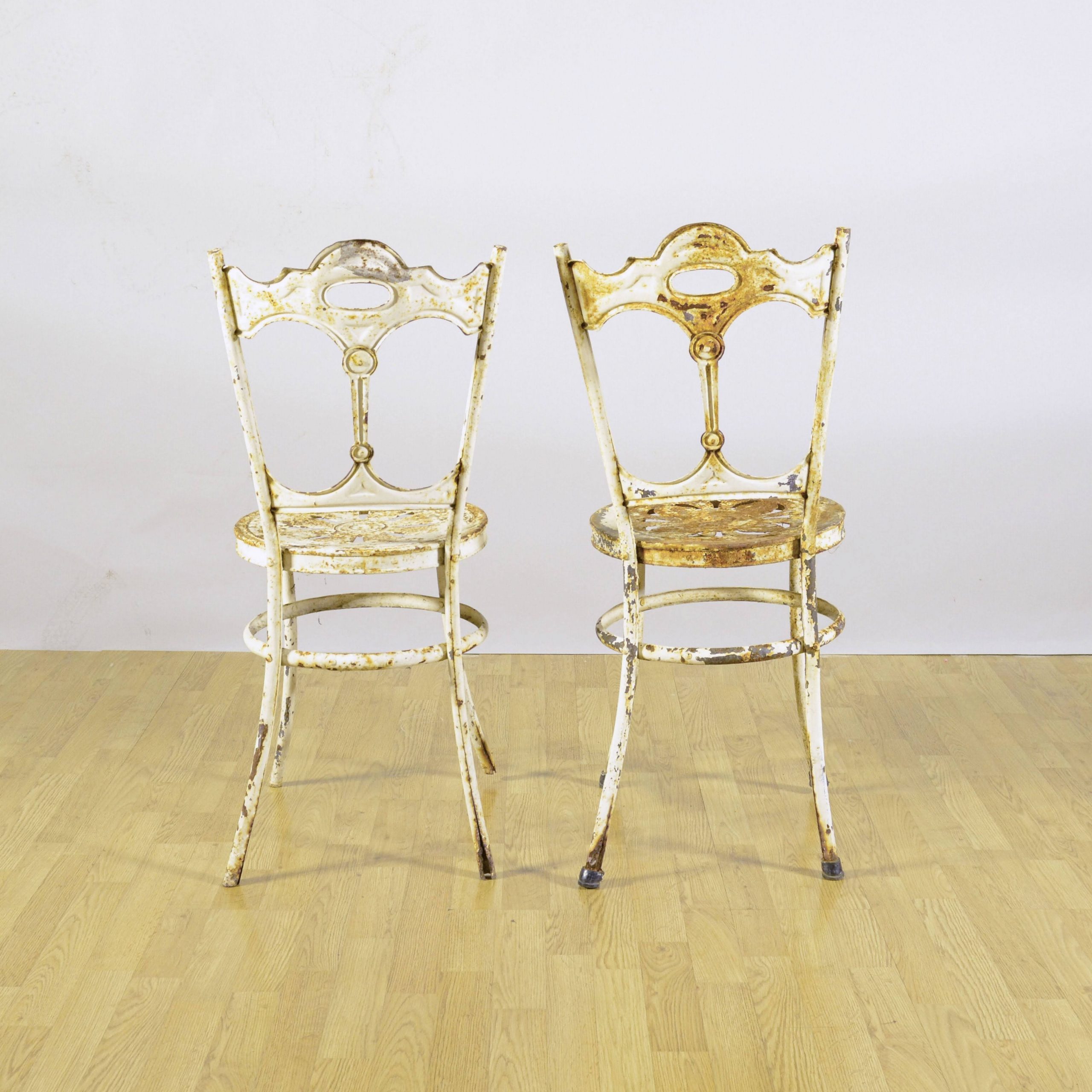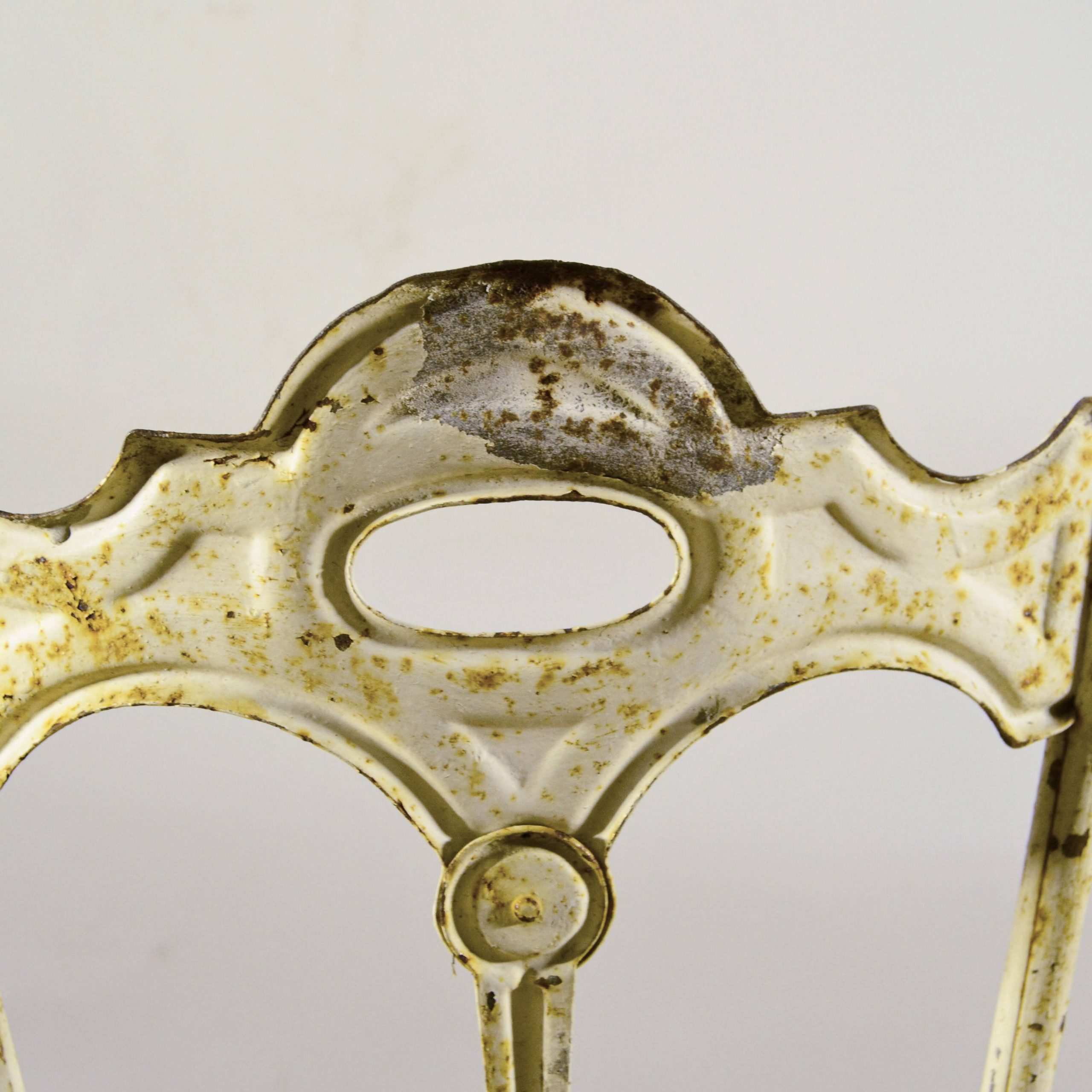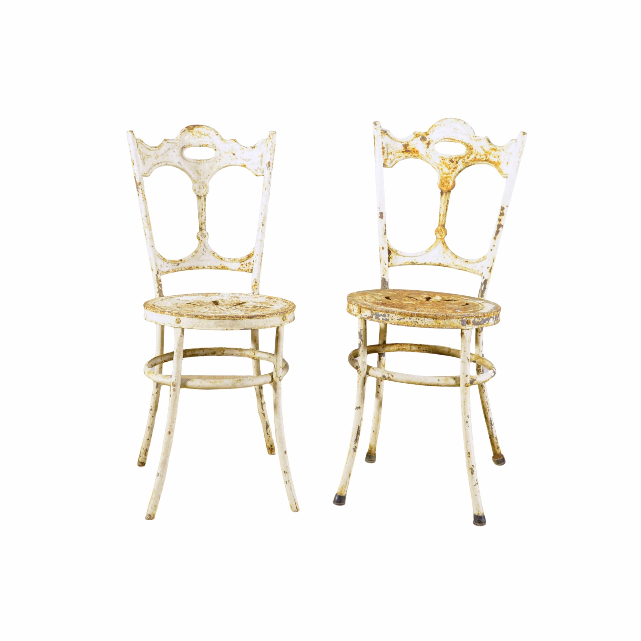 Coppia di sedie da giardino francesi dei primi ’900 realizzate in ferro verniciato bianco, con seduta traforata e schienale slanciato. La patina del tempo ne esalta il fascino autentico, rendendole perfette per giardini, terrazze o ambienti outdoor dal gusto vintage.
