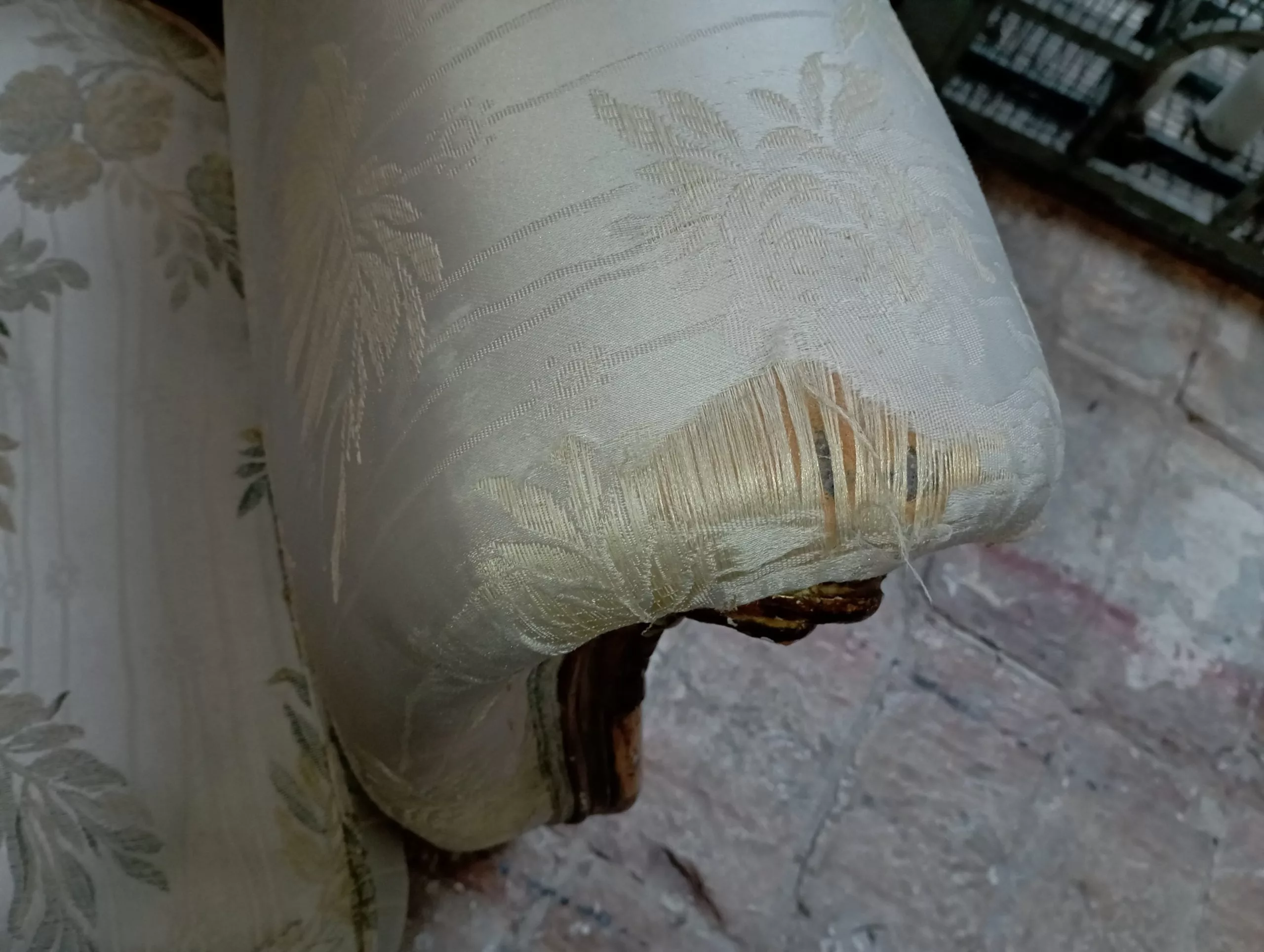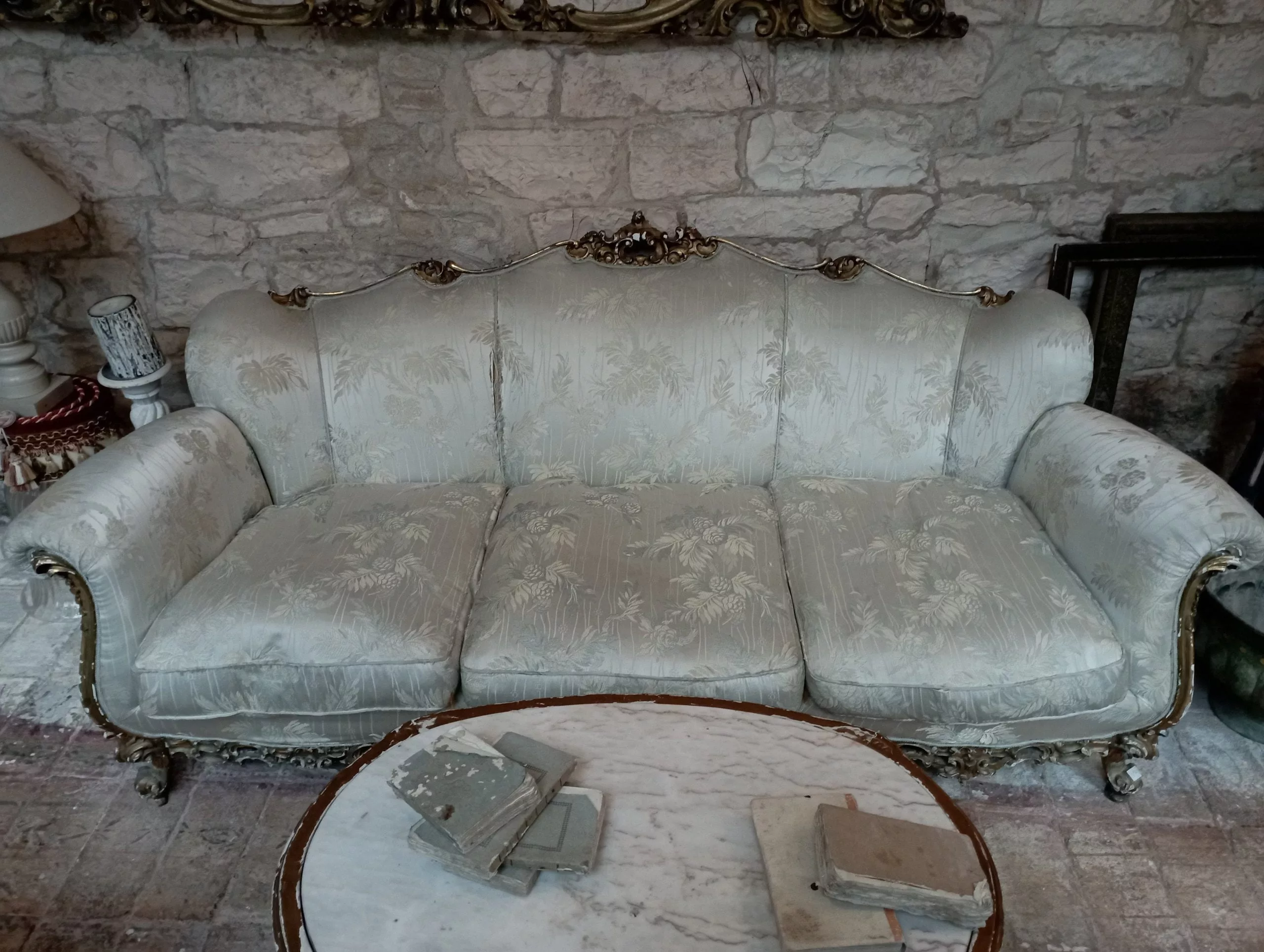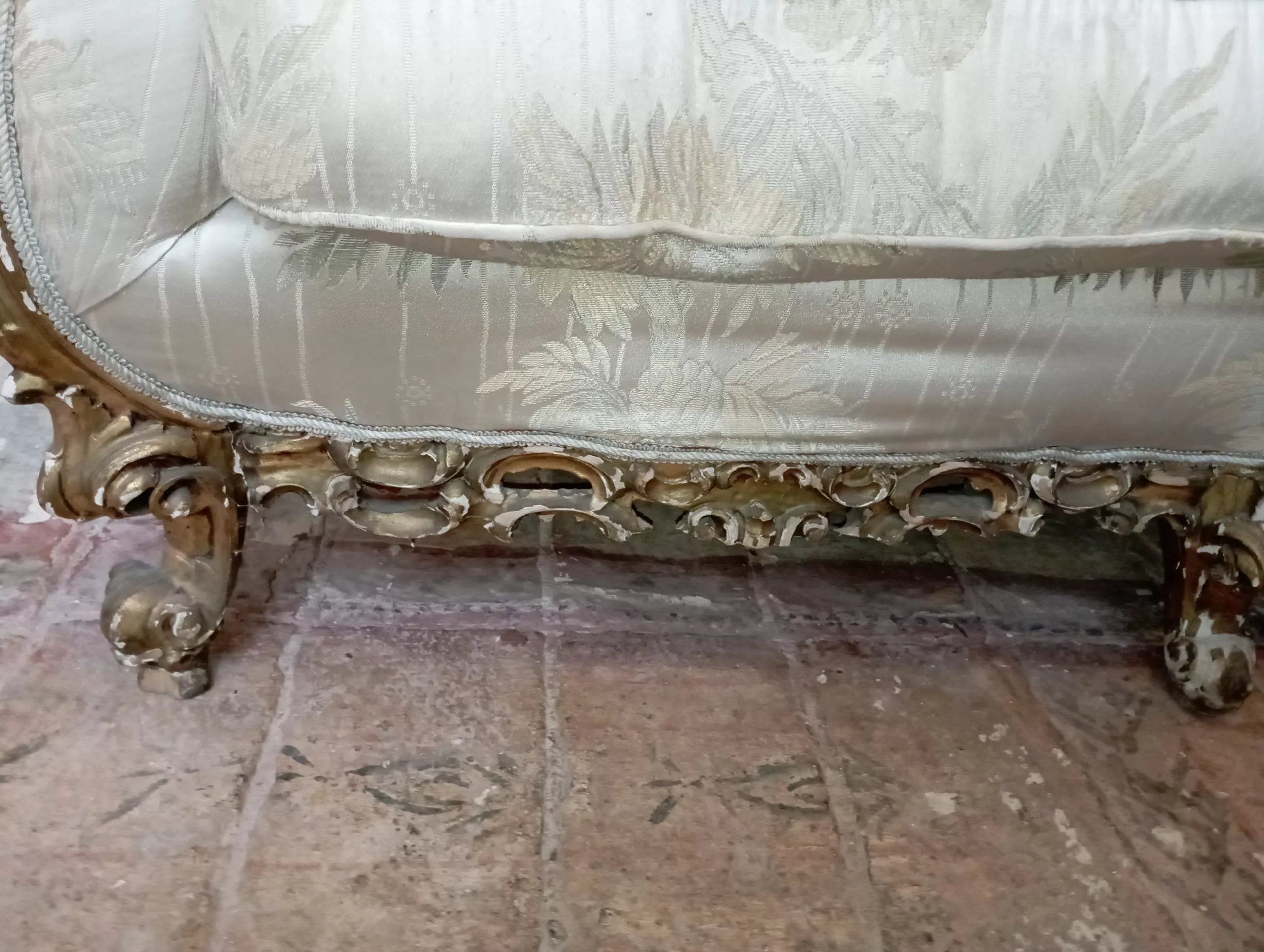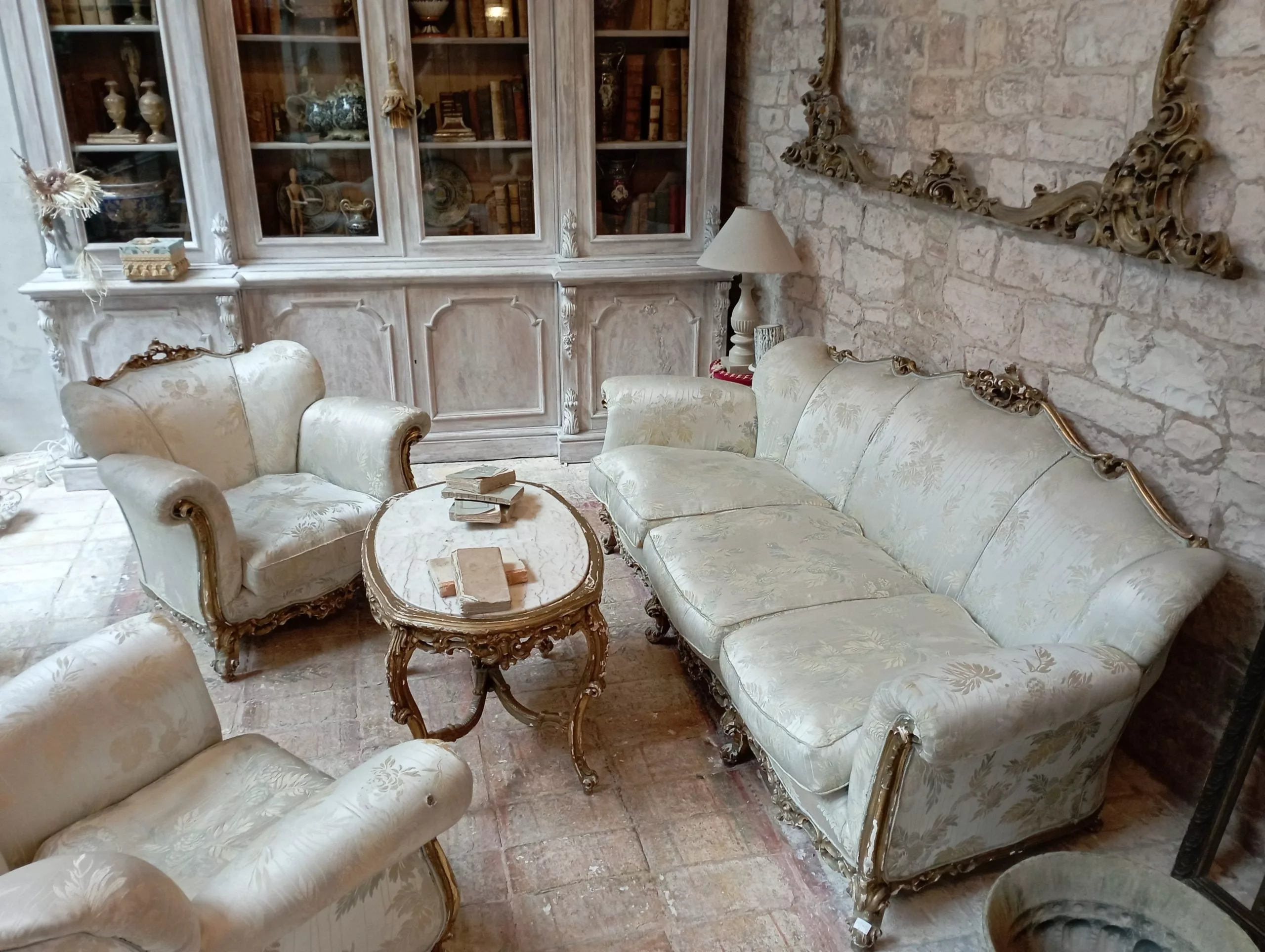 Set Salotto del ‘700 in legno dorato e dalla forma classica composto da 2 poltrone, tavolino in marmo ed un divano di grandi dimensioni.