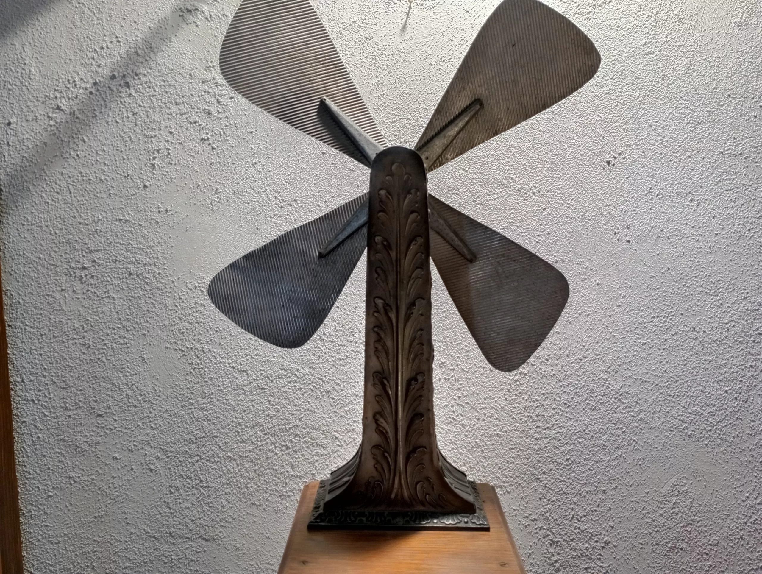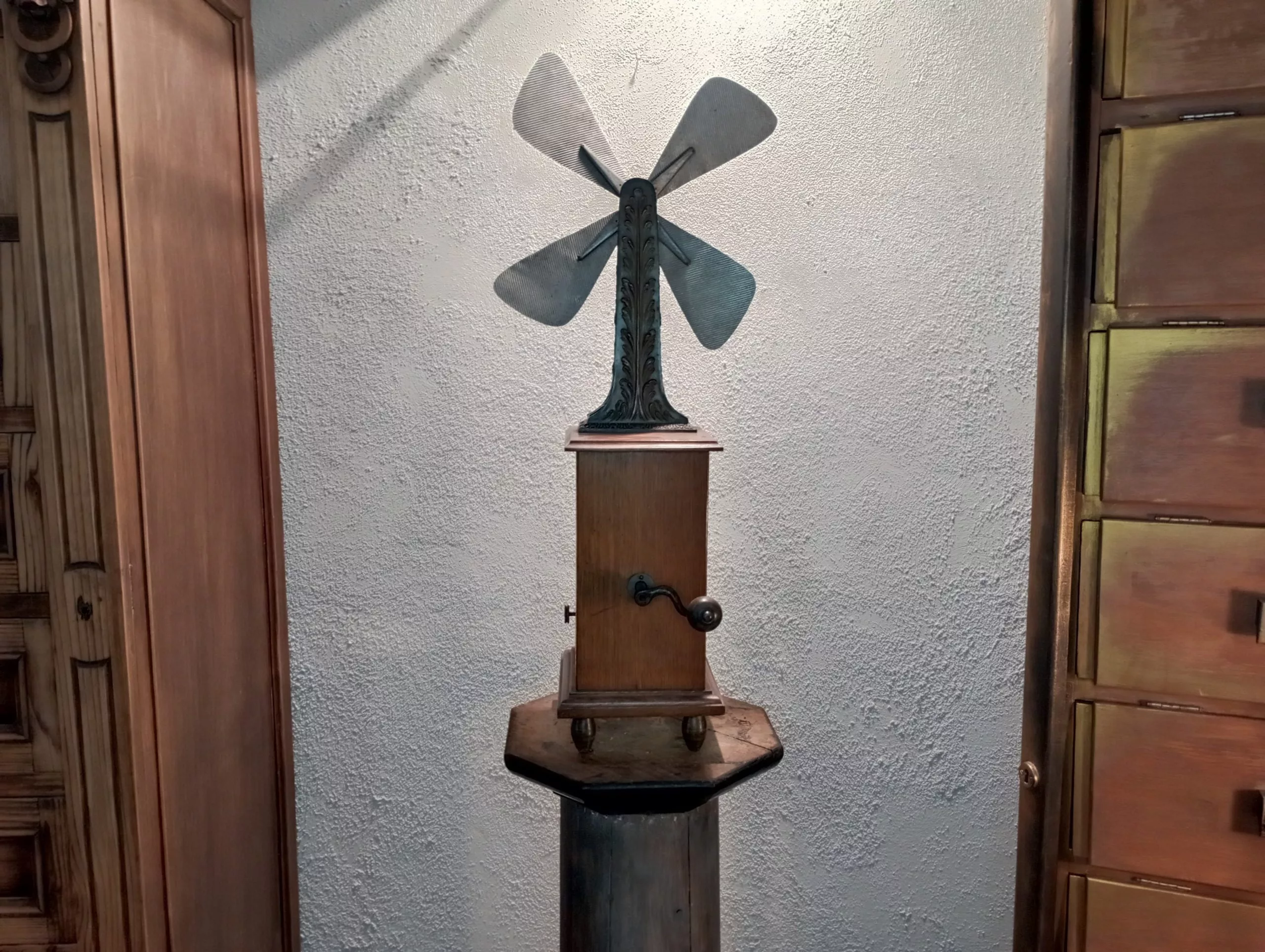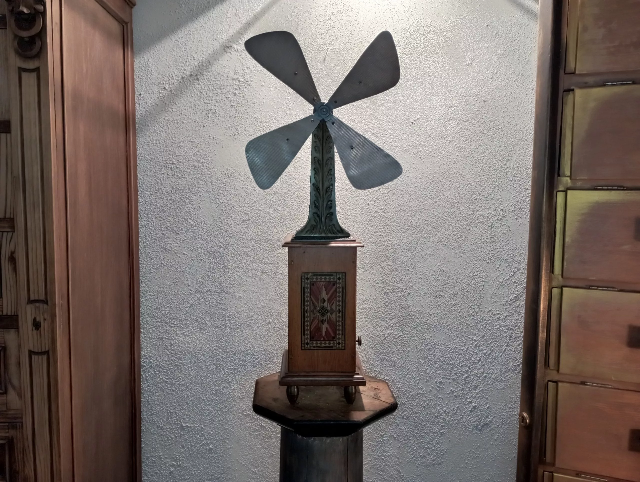 Ventilatore con Carica a Molla Zephyr Paris prodotto nel 1902 “G.K. Breveté” con base lignea che richiudo il sistema di ingranaggi per la carica a molla.