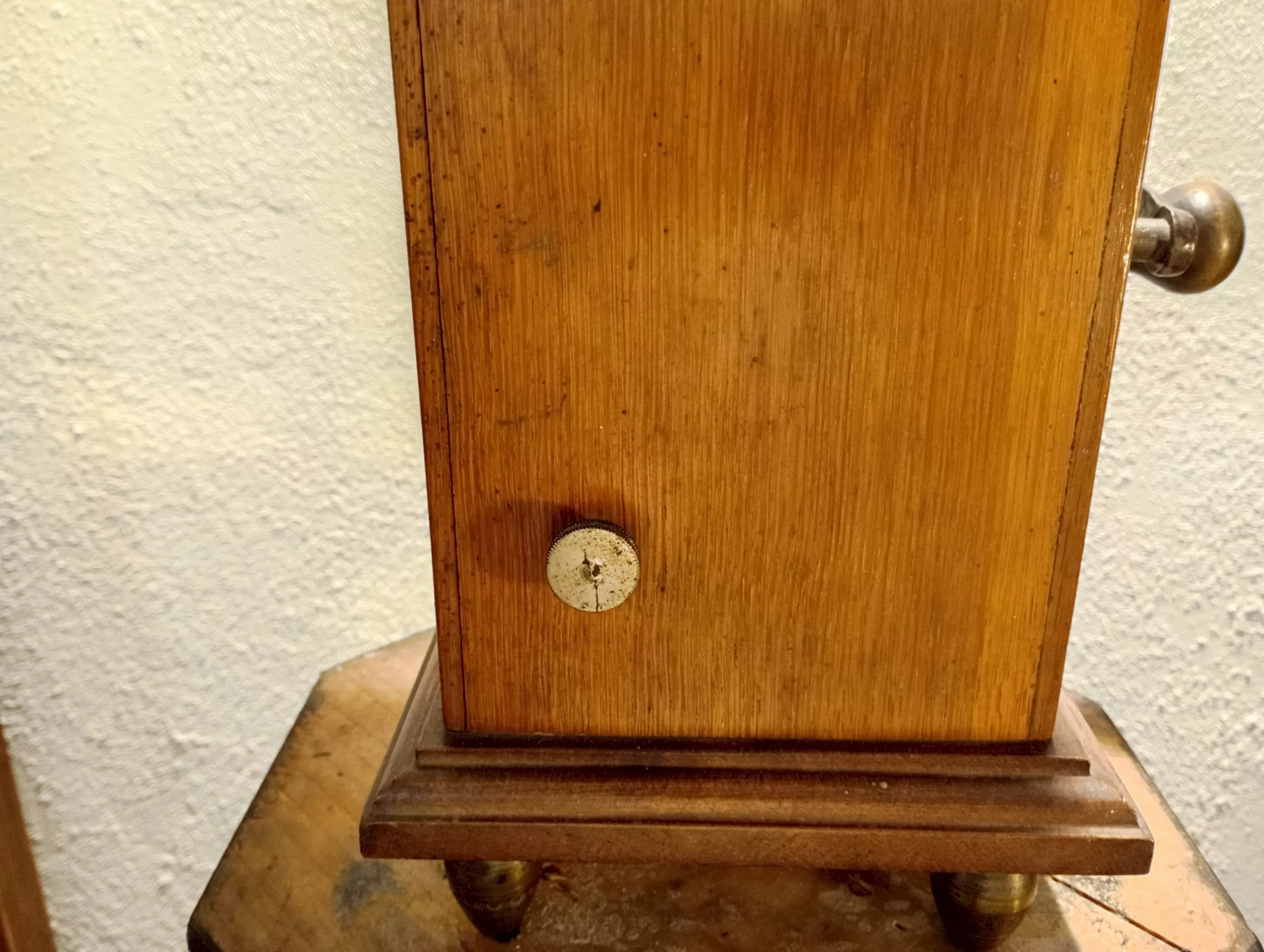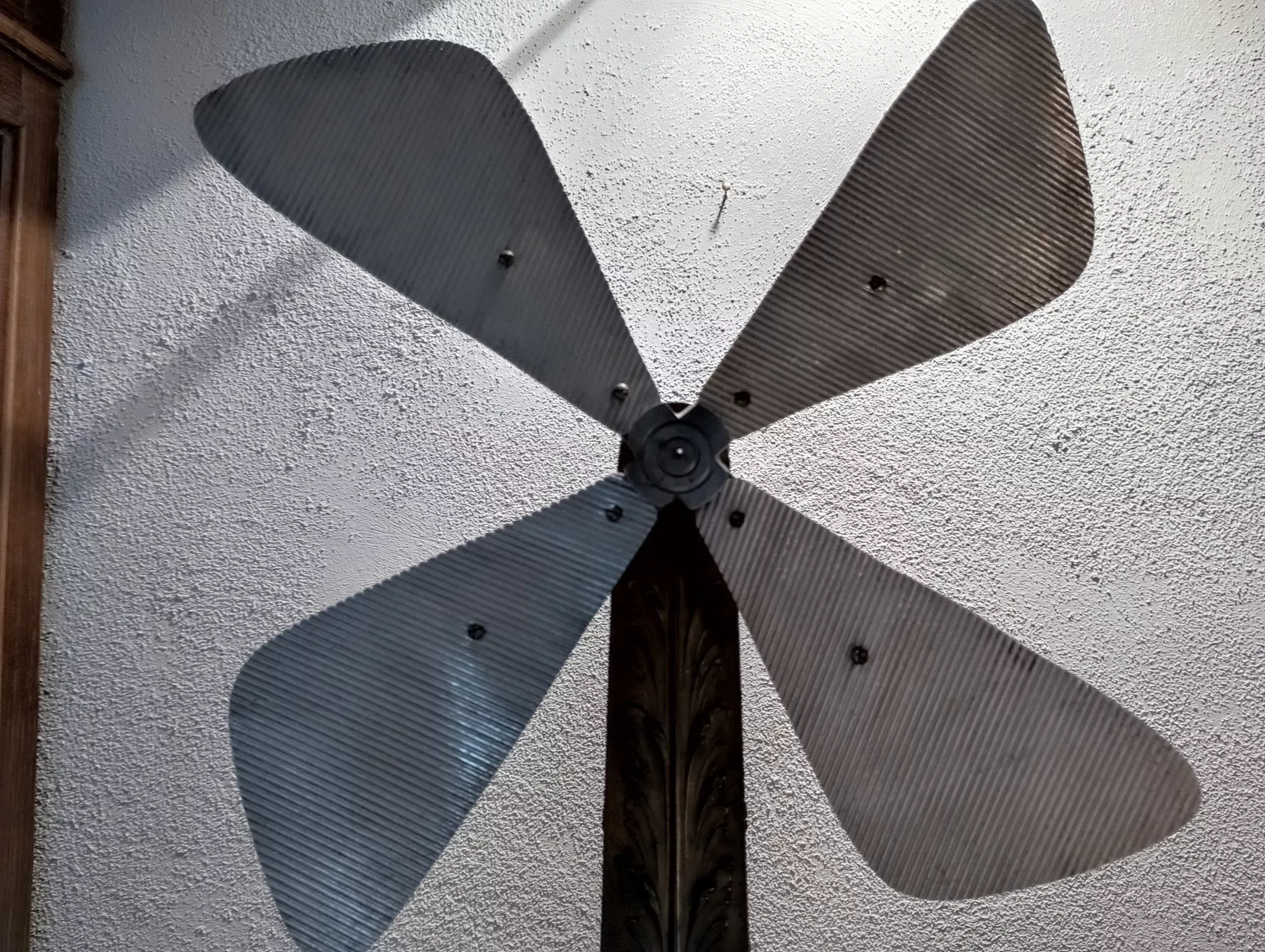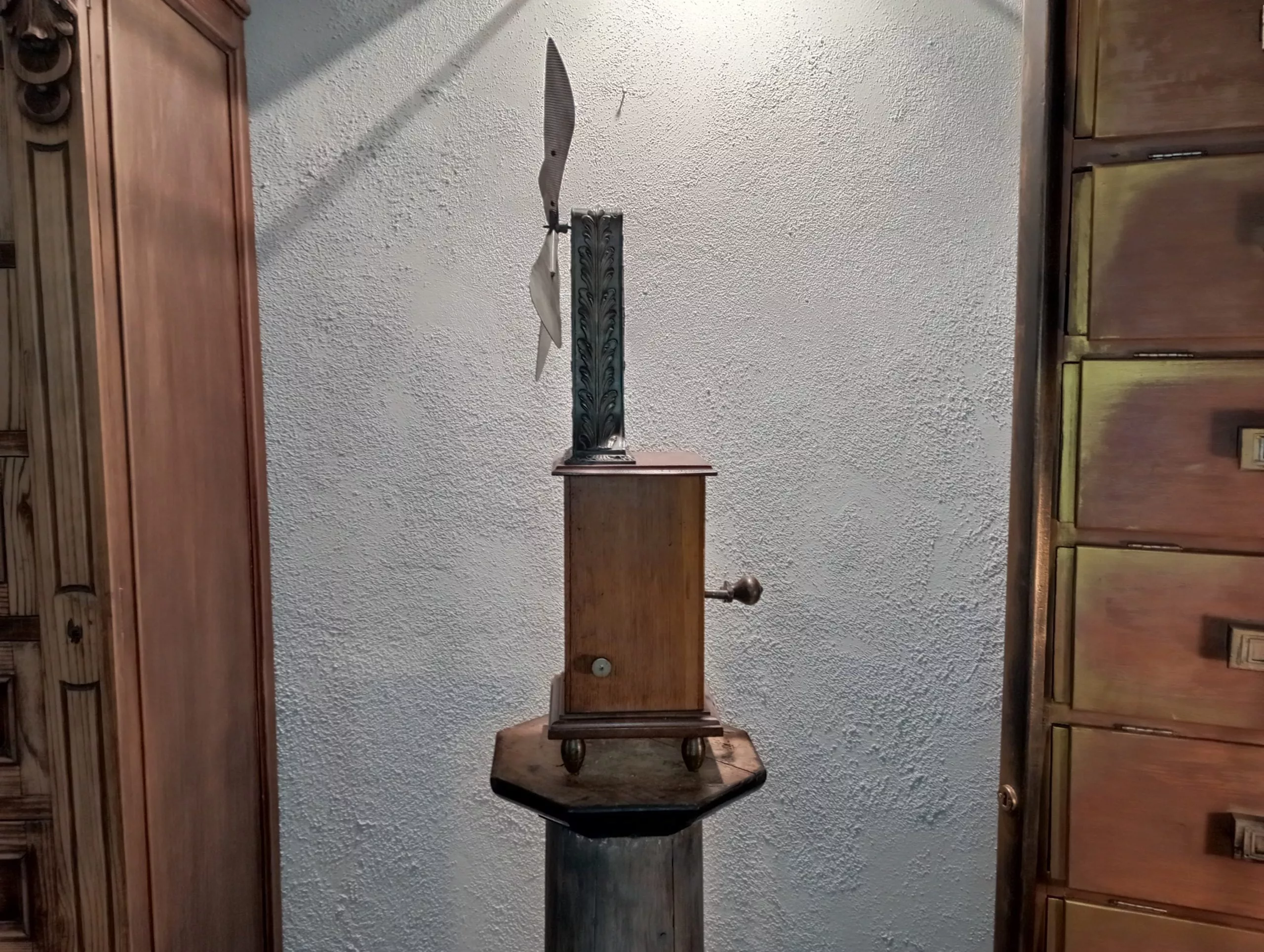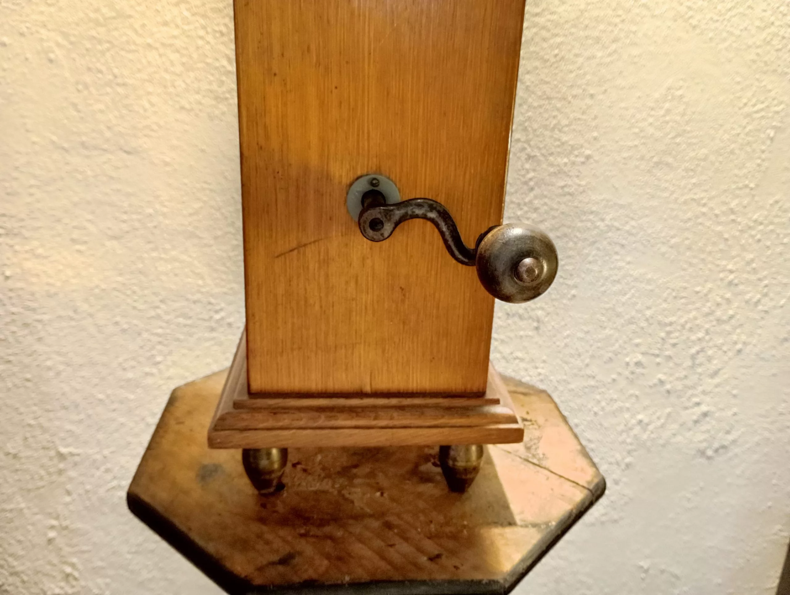 Ventilatore con Carica a Molla Zephyr Paris prodotto nel 1902 “G.K. Breveté” con base lignea che richiudo il sistema di ingranaggi per la carica a molla.